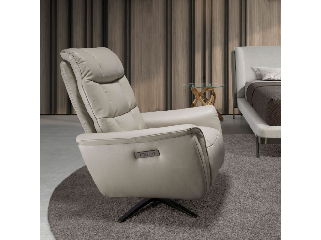 Toto otočné křeslo se stane vaším společníkem pro chvíle relaxace i moderní designovou ozdobou obývacího prostoru. Jeho jemné křivky a čalounění z kvalitní hovězí kůže přinesou do místnosti eleganci a černá lakovaná podnož z nerezové oceli podtrhne jeho současný styl. Elektrický relaxační mechanismus vám umožní nastavit opěrku zad a nohou přesně podle vašich potřeby, a USB i USB-C porty vám usnadní nabíjení elektro zařízení, které chcete mít při odpočinku po ruce. Tento kousek spojuje estetiku s funkčností – vše, co očekáváte od moderního nábytku.