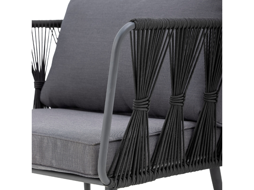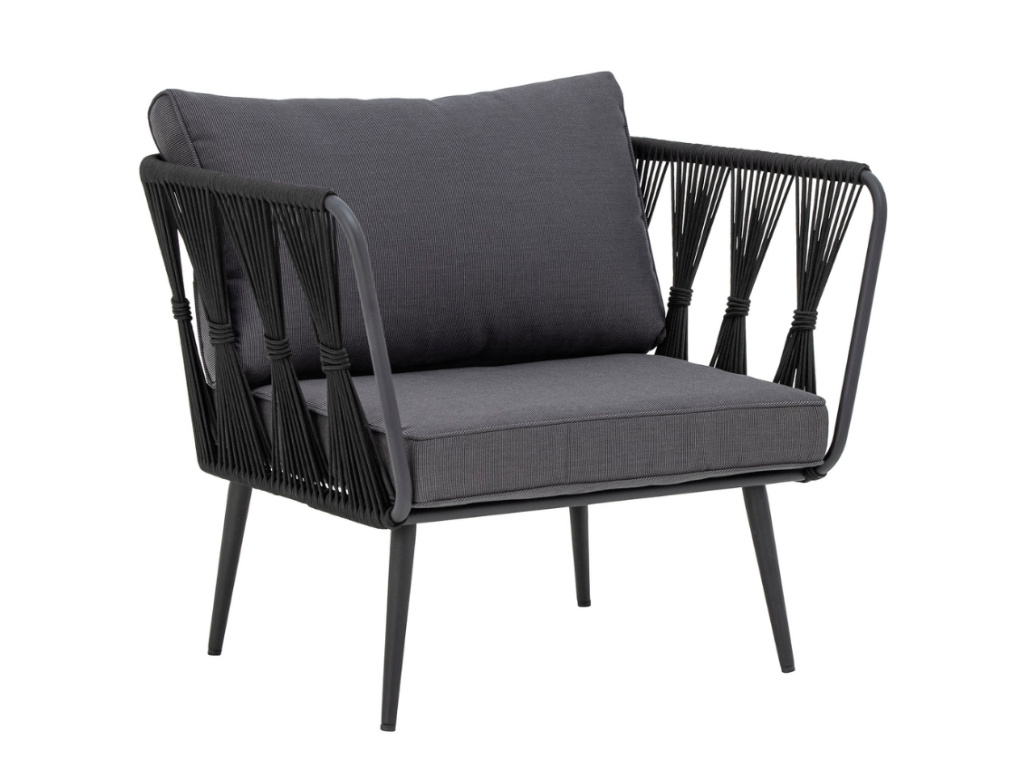 Zahradní lounge křeslo Bloomingville Pavone vás okouzlí severským vzhledem a krásnými decentními detaily. Konstrukce s podnoží je vyrobena z černě lakovaného kovu a celému kousku dodá nádech lehkosti a vzdušnosti. Konstrukci zdobí krásné detaily v podobě lanového výpletu, který jí dodá na originalitě. Maximální pohodlí zajistí měkký sedák a polštář, potažený příjemným čalouněním. To lze v případě potřeby sundat a vyprat, avšak maximálně na 30 stupňů. Užijte si tuto venkovní designovku s vysokým komfortem, která vkusně doplní váš zahradní nábytek.