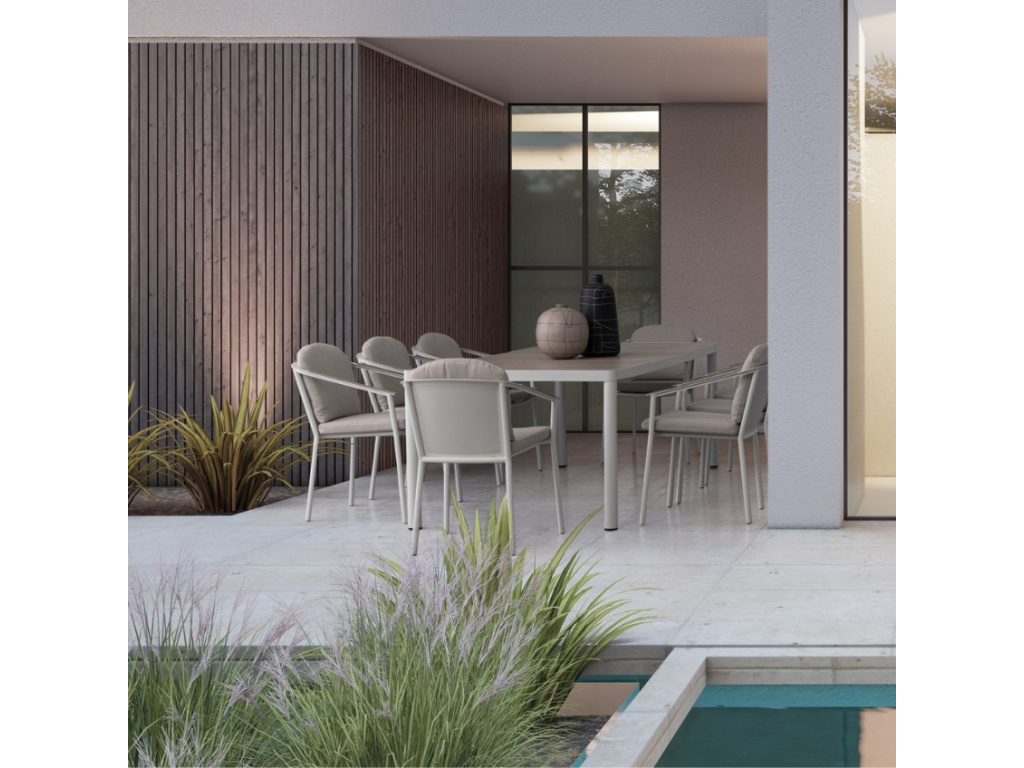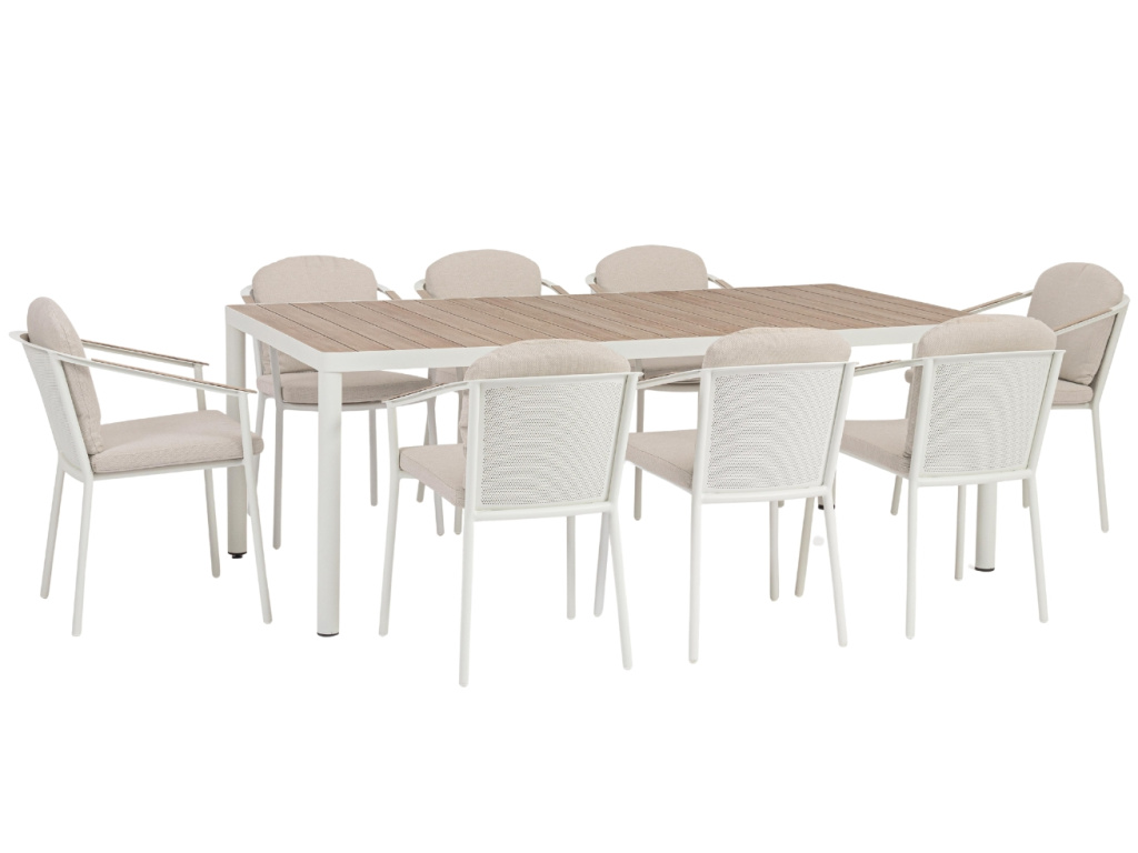 Proměňte svou zahradu nebo terasu v místo, kde se snoubí design, pohodlí a odolnost. Venkovní set Ulises od značky Bizzotto je dokonalým řešením pro každého, kdo si chce užít chvíle s rodinou a přáteli na čerstvém vzduchu – stylově a bez kompromisů. Hliníková konstrukce s práškovým nástřikem zaručuje maximální odolnost vůči počasí, zatímco deska stolu v dekoru dřeva dodá celému setu hřejivý vzhled. Osm pohodlných židlí s měkkými polštáři potaženými vodoodpudivou látkou a prostorný stůl s čistými liniemi vytvářejí harmonický celek, který zaujme na první pohled. Každý detail byl navržen s důrazem na funkčnost – židle lze snadno stohovat a jejich potahy se dají sejmout a vyprat.