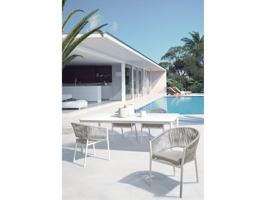 Jednoduchá zahradní židle Bizzotto Florencia zcela jistě zaujme hustě proplétaným opěradlem. Opěradlo je tvořeno z polyesterového lana, zatímco rám je z lakovaného bílého hliníku. Židle nabízí pohodlný podsedák z olefinové tkaniny, která je velmi odolná vůči vodě a UV záření. Potah je samozřejmě odnímatelný a židle jsou stohovatelné. Tuto židli jistě oceníte na své terase nebo v jiných venkovních prostorech.