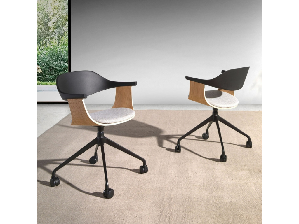 Moderní kancelářská židle kombinuje světle šedé čalounění sedáku s elegantním černým opěradlem z PVC a rámem z dubové dýhy. Tato stylová kombinace přinese do vaší domácí kanceláře nebo pracovny hřejivý nádech dřeva a svěží kontrast moderních linií. Polstrovaný sedák a ergonomické područky vám zajistí pohodlí i při dlouhých hodinách práce. Díky otočné základně a kolečkům si usnadníte pohyb po pracovním prostoru, aniž byste museli obětovat styl. Perfektní volba pro ty, kdo hledají funkčnost a design v jednom.