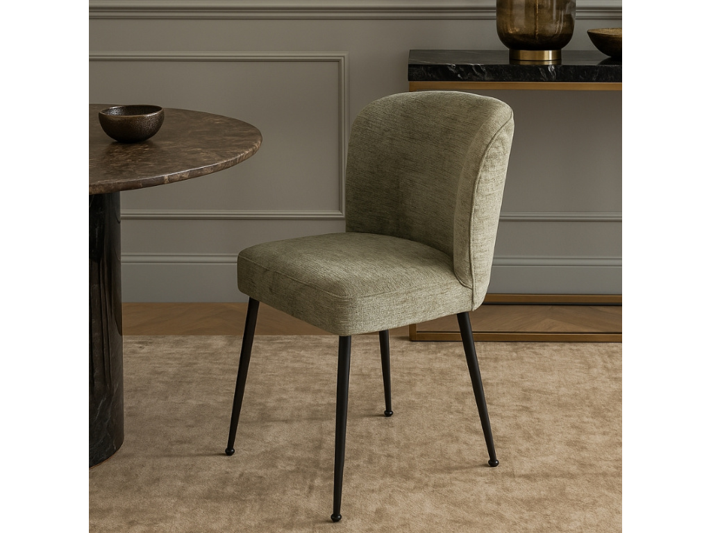 Jídelní židle Fallon značky Richmond je čalouněna příjemnou látkou šedo zelené barvy, která vytváří s černě lakovanou ocelovou podnoží elegantní kontrast. Židle je díky vysokému opěradlu velice pohodlná a využití může najít nejen v kuchyni nebo jídelně, ale také v pracovně nebo u toaletního stolku.