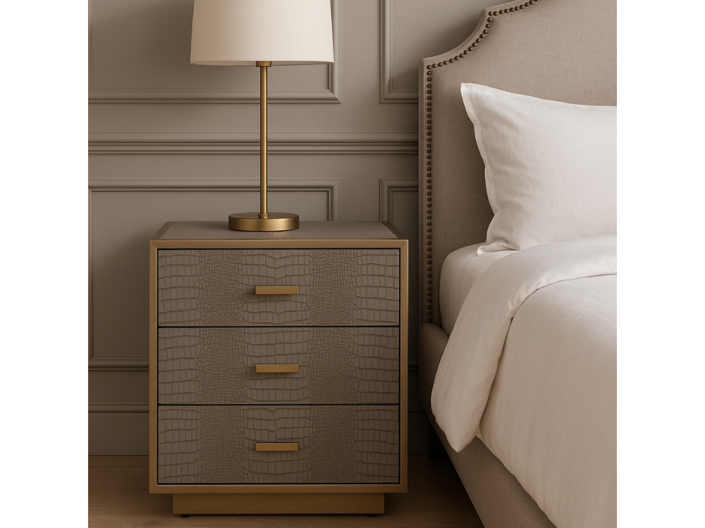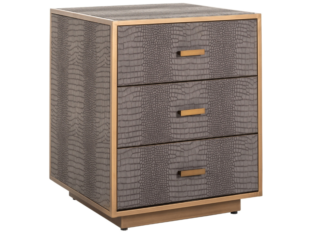 Noční stolek Classio od značky Richmond Interiors zaujme na první pohled exkluzivním designem. Celý stolek je čalouněný vegan ekokůží v šedé barvě, která připomíná krokodýlí kůži, čímž si zaslouží obdiv i pozornost každého milovníka extravagantního stylu. Stolek má zlatě lakovaný kovový zdobný rám, který mu dodává elegantní design. Classio se skvěle hodí do nevšedních, moderních až glamour interiérů.