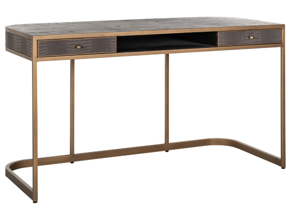 Pracovní stůl Classio od značky Richmond Interiors zaujme na první pohled exkluzivním designem. Celý stůl je čalouněný vegan ekokůží v šedé barvě, která připomíná krokodýlí kůži, čímž si zaslouží obdiv i pozornost každého milovníka extravagantního stylu. Stůl má zlatě lakovaný kovový zdobný rám, který mu dodává elegantní design. Classio se skvěle hodí do nevšedních, moderních až glamour interiérů.