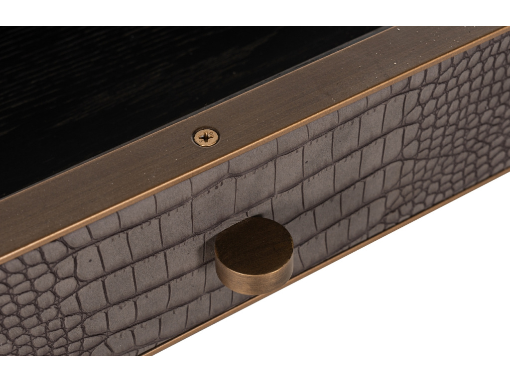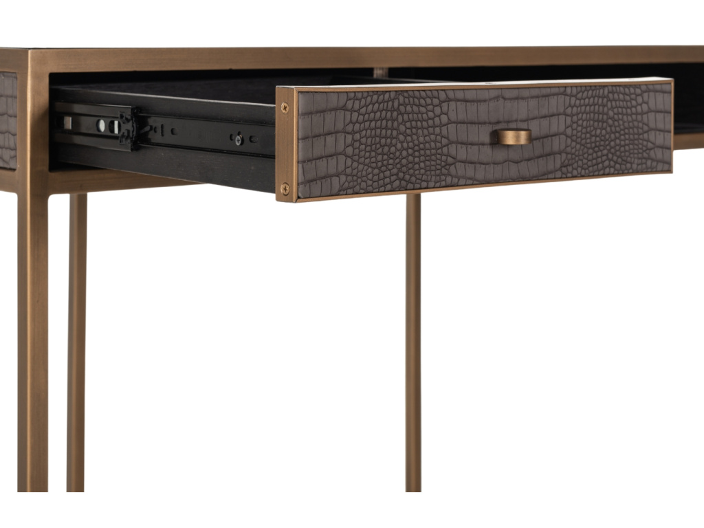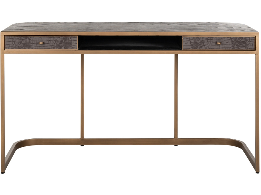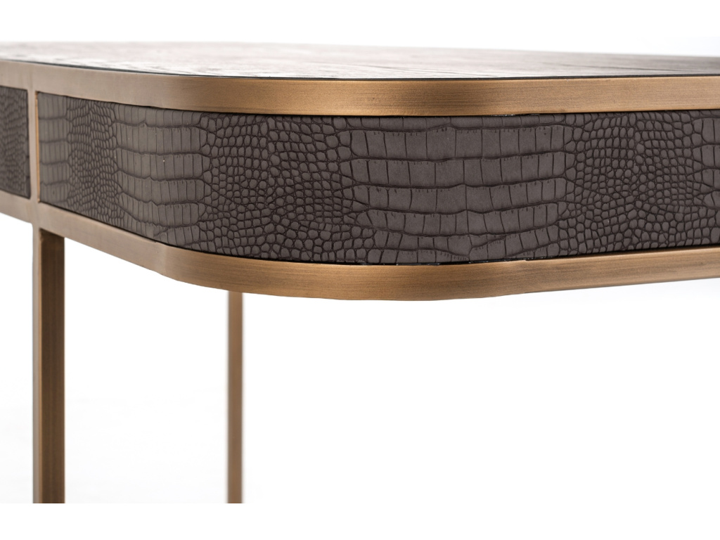 Pracovní stůl Classio od značky Richmond Interiors zaujme na první pohled exkluzivním designem. Celý stůl je čalouněný vegan ekokůží v šedé barvě, která připomíná krokodýlí kůži, čímž si zaslouží obdiv i pozornost každého milovníka extravagantního stylu. Stůl má zlatě lakovaný kovový zdobný rám, který mu dodává elegantní design. Classio se skvěle hodí do nevšedních, moderních až glamour interiérů.