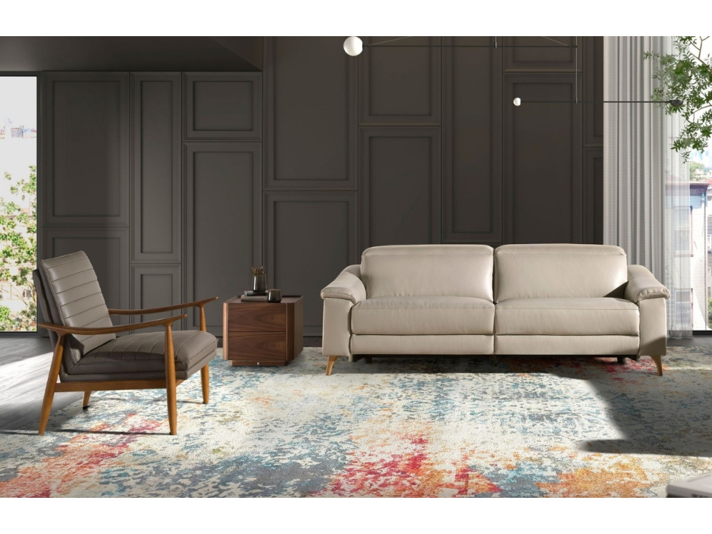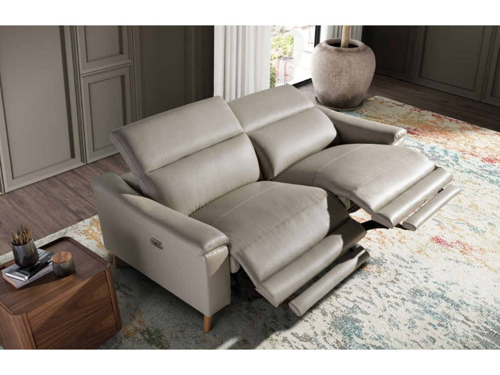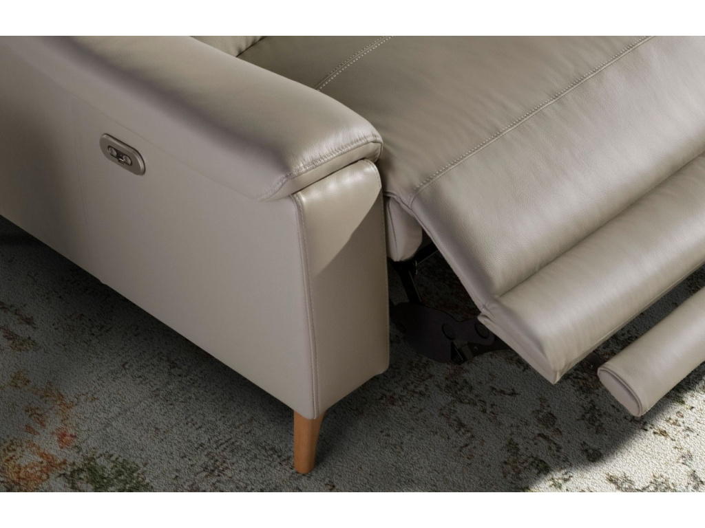 Tato elegantní šedobéžová pohovka čalouněná hovězí kůží se stane středobodem vašeho obývacího pokoje. Její jemný design doplněný o medově zbarvenou dřevěnou podnož přidá prostoru nádech nadčasové elegance a přirozeného šarmu. S integrovanými elektrickými relaxačními systémy objevíte nový rozměr odpočinku – jednoduše si nastavíte opěrku hlavy, zad i nohou podle svého přání. Díky kvalitnímu čalounění z hovězí kůže se můžete těšit na příjemný povrch, který nabízí pohodlí i odolnost na mnoho let. Praktický USB port vám umožní mít svá zařízení vždy po ruce, zatímco si vychutnáváte pohodový večer nebo čtete oblíbený časopis. Tato pohovka bude ideálním společníkem pro chvíle klidu i rodinné setkání.