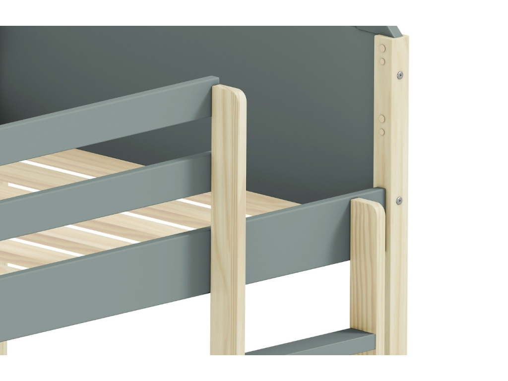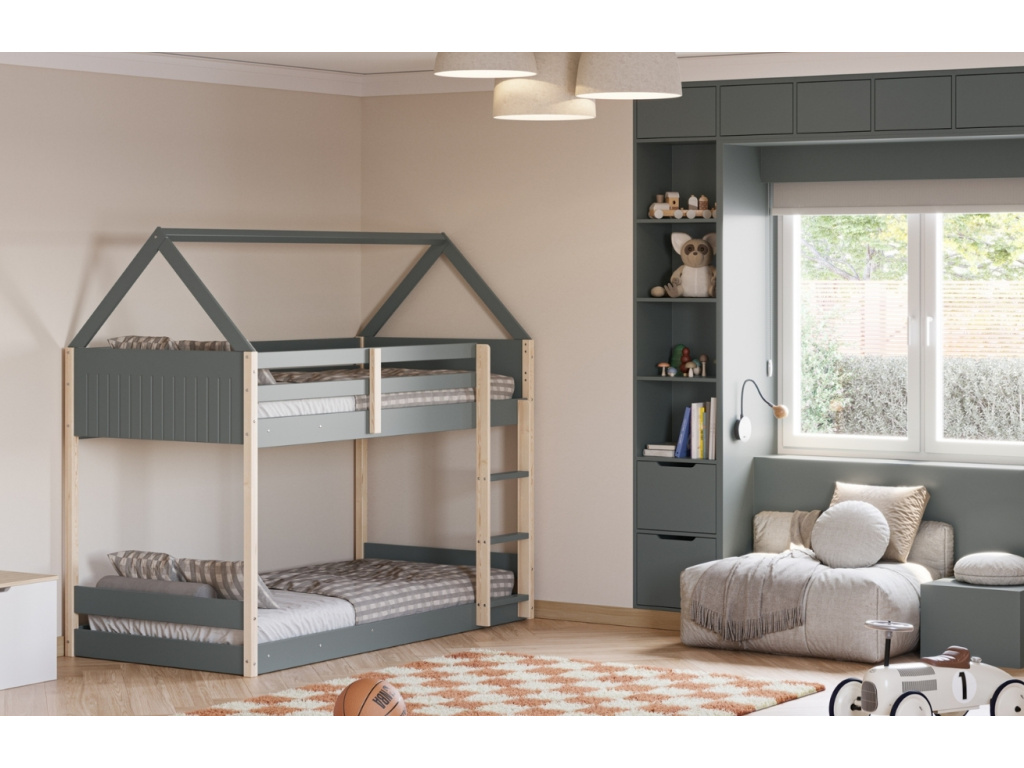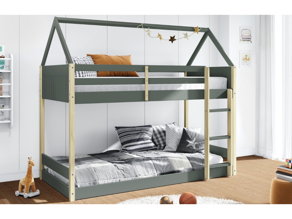 Dvoupatrová postel Sila od značky Marckeric promění dětský pokoj v kouzelný domeček plný fantazie. Kombinace laku v khaki odstínu a přírodního borovicového dřeva působí svěže a hravě, zatímco střešní rám dodává posteli originální výraz. Horní i dolní lůžko nabízí pohodlný spánek sourozencům nebo prostor pro hosty, a zároveň šetří cenné místo v interiéru. Díky konstrukci z masivního dřeva a MDF je postel stabilní, bezpečná a připravená na každodenní dětská dobrodružství.