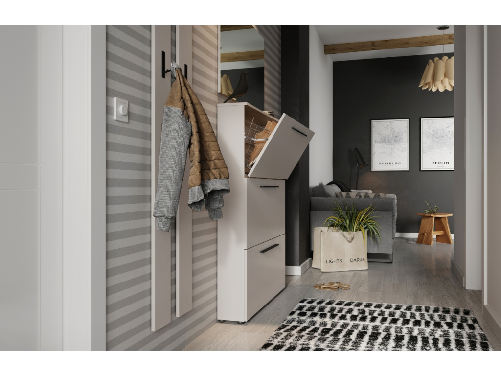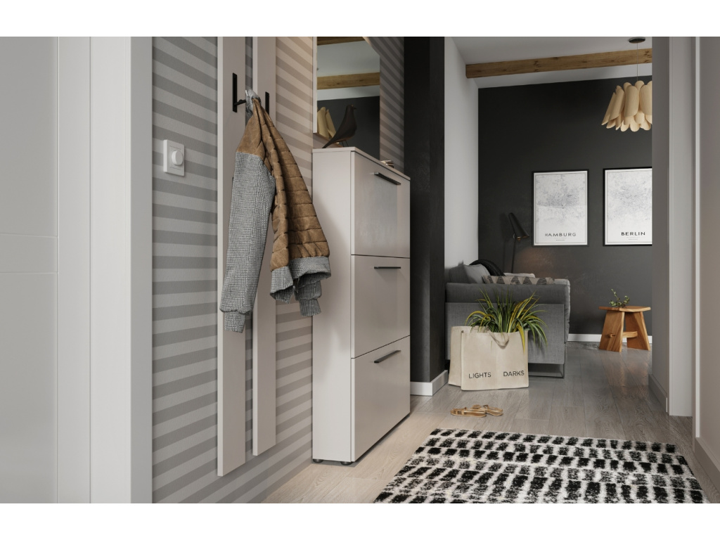 Designový botník Utah vás zaujme svým příjemným vzhledem. Je vyrobený z laminátu a na originalitě mu dodávají černé kovový úchytky, které v kombinaci s šedě lakovaným korpusem botníku vypadají skvěle. Botník Utah přinese do vaší předsíně pocit tepla a stane se nezbytnou součástí vašeho domova. Dvě výklopné zásuvky nabízejí prostor pro uložení až 12 párů bot. Botník je ideální především do menších interiérů, kde díky němu získáte praktický prostor pro uložení obuvi.