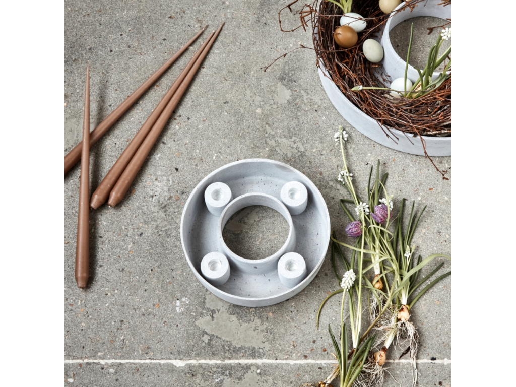 Kruhový svícen Ring od značky House Doctor působí minimalisticky a současně originálně díky atypickému materiálu s betonovým vzhledem a jemně nepravidelné textuře. Má čtyři symetricky rozmístěná místa pro svíčky a mezi nimi dostatek prostoru pro dekorace. Stačí přidat větvičky, květiny nebo drobné sezónní dekorace a rázem z něj vznikne osobitá vánoční či velikonoční výzdoba s moderním nádechem. Jeho světlý betonový vzhled snadno doplní moderní i rustikální interiéry, kde vytvoří krásné aranžmá stolu či komody.