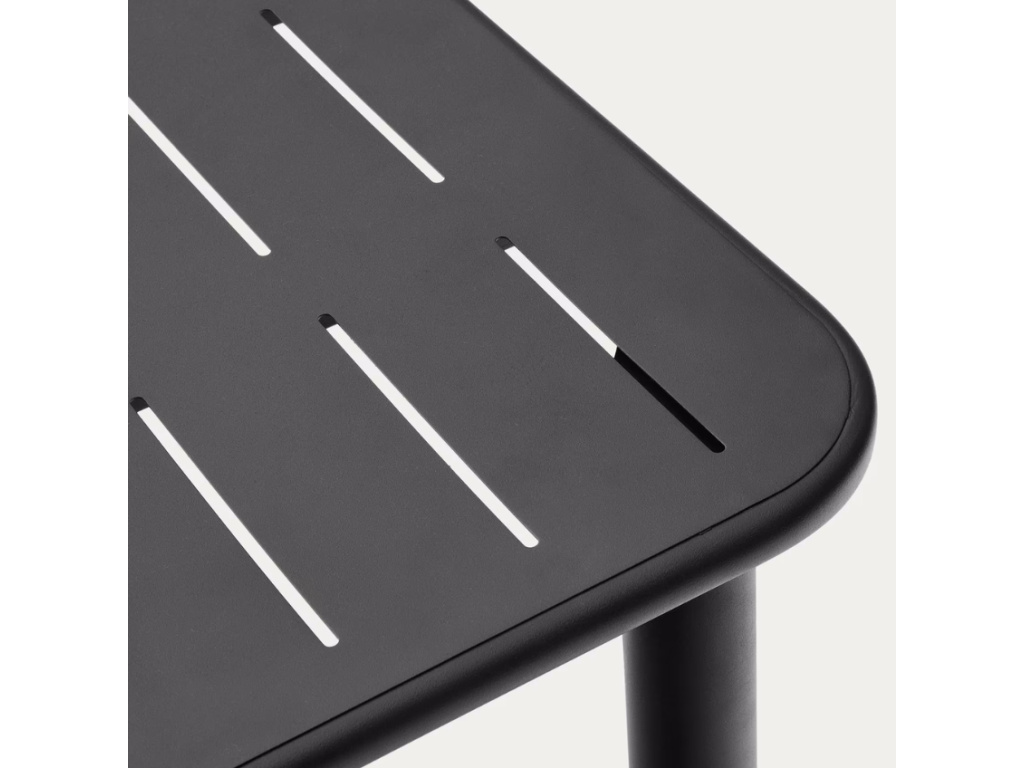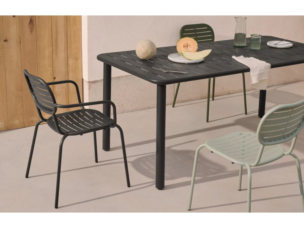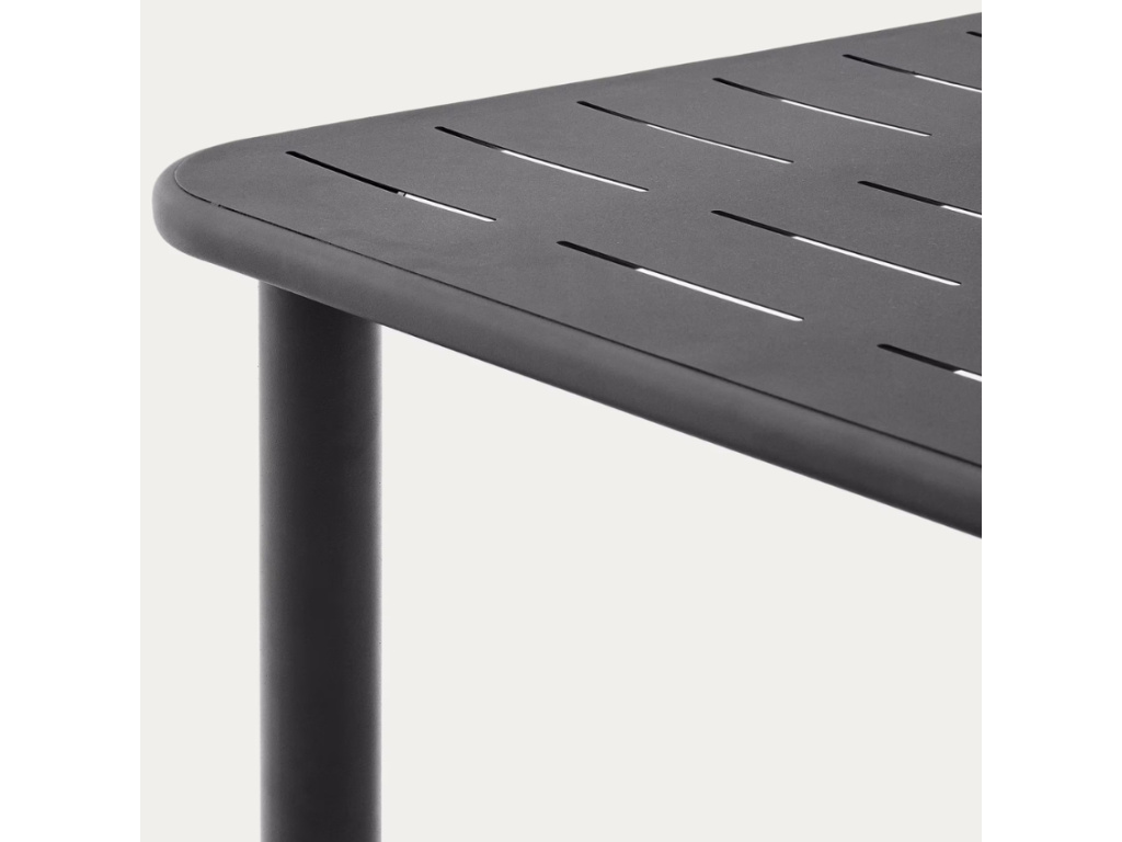 Kolekce zahradního nábytku Brai od značky Kave Home vyniká minimalistickým designem s oblými tvary a jemnými drážkami, které poskytují vizuální lehkost a současně praktičnost. Stůl v tmavě šedém odstínu je vyroben z pozinkované oceli, která je vůči oděru a korozi odolnější než běžná ocel. Podnož je opatřena plastovými chrániči, které chrání podlahu před poškrábáním. K dispozici je také varianta s čtvercovou deskou a několik barevných provedení pro dokonalé sladění s vaší terasou či zahradou.