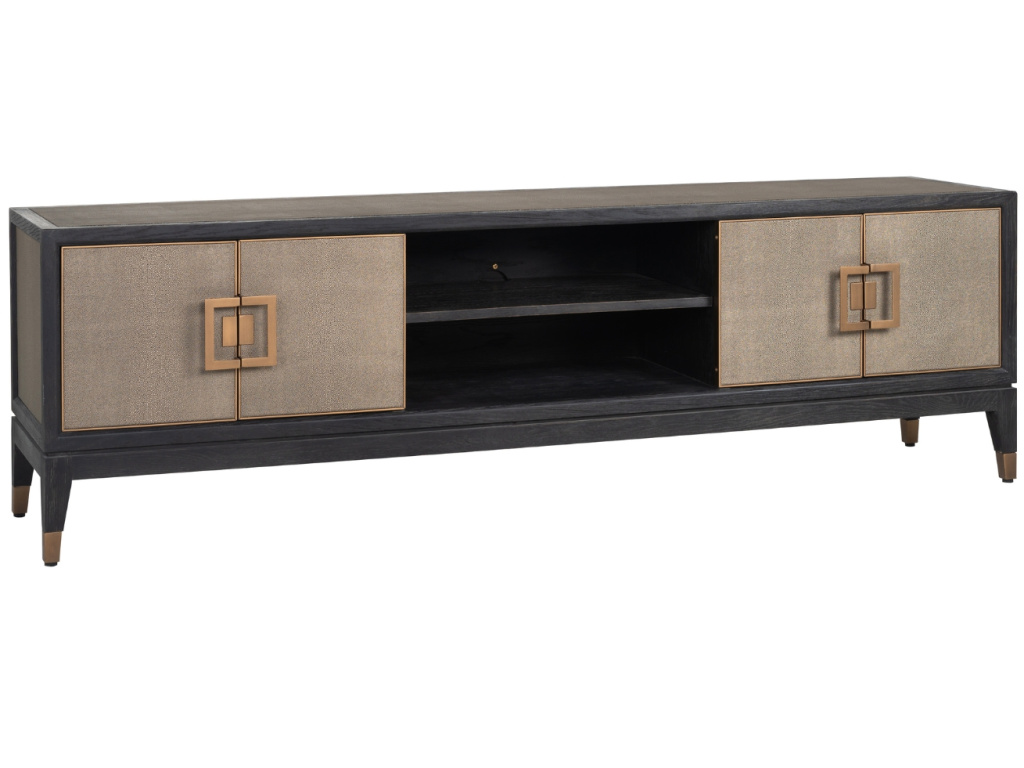 Ekokůže na nábytku vypadá stylově a luxusně. TV stolek Richmond Bloomingville se pyšní čalouněním z kvalitní strukturované ekokůže, která má zajímavý šedý odstín. Čalounění je ozvláštněno výraznými kovovými úchytkami, které svou zlatou barvou skvěle ladí s kovovými ozdobnými detaily na podnoži. Stolek nabízí úložný prostor v podobě dvou otevřených a dvou zavřených polic.