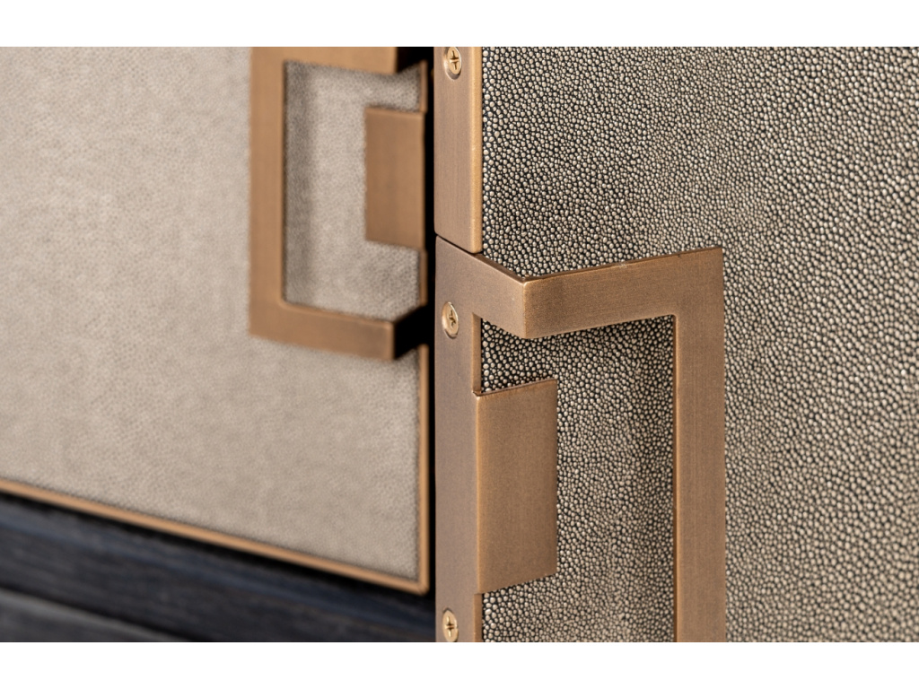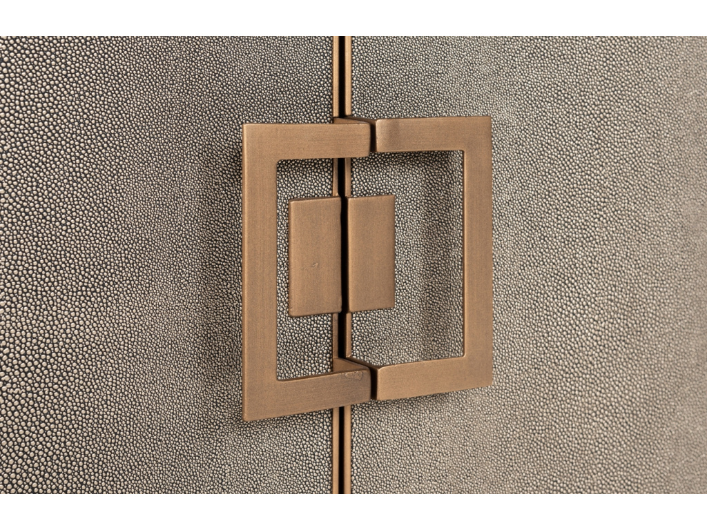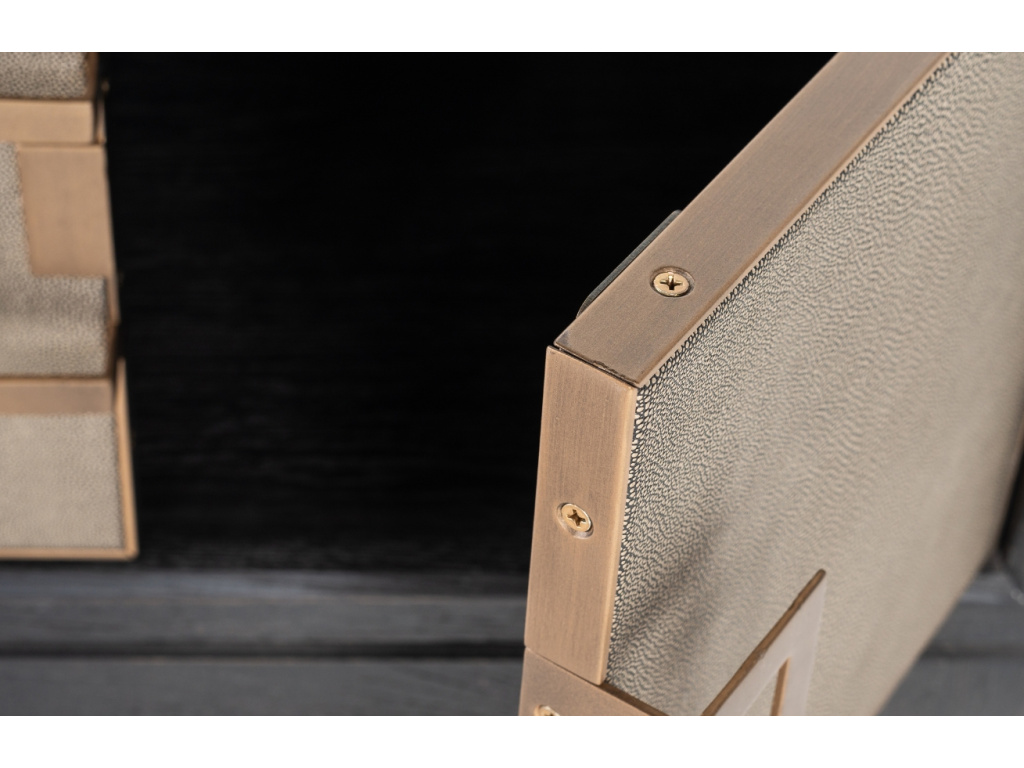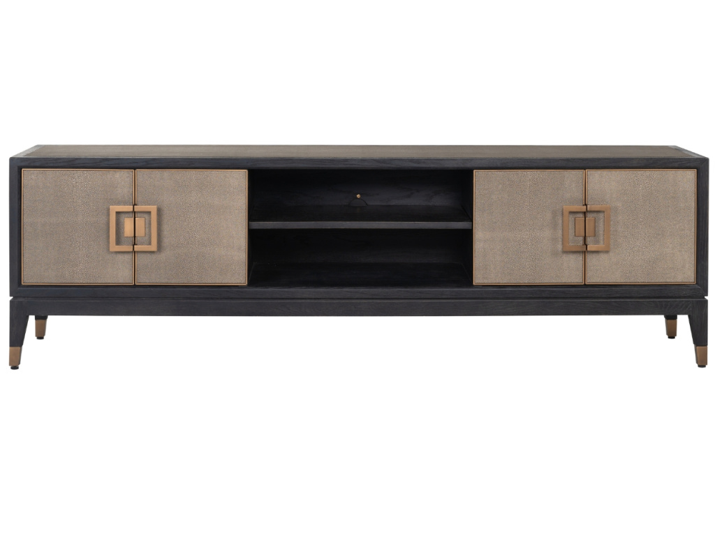 Ekokůže na nábytku vypadá stylově a luxusně. TV stolek Richmond Bloomingville se pyšní čalouněním z kvalitní strukturované ekokůže, která má zajímavý šedý odstín. Čalounění je ozvláštněno výraznými kovovými úchytkami, které svou zlatou barvou skvěle ladí s kovovými ozdobnými detaily na podnoži. Stolek nabízí úložný prostor v podobě dvou otevřených a dvou zavřených polic.