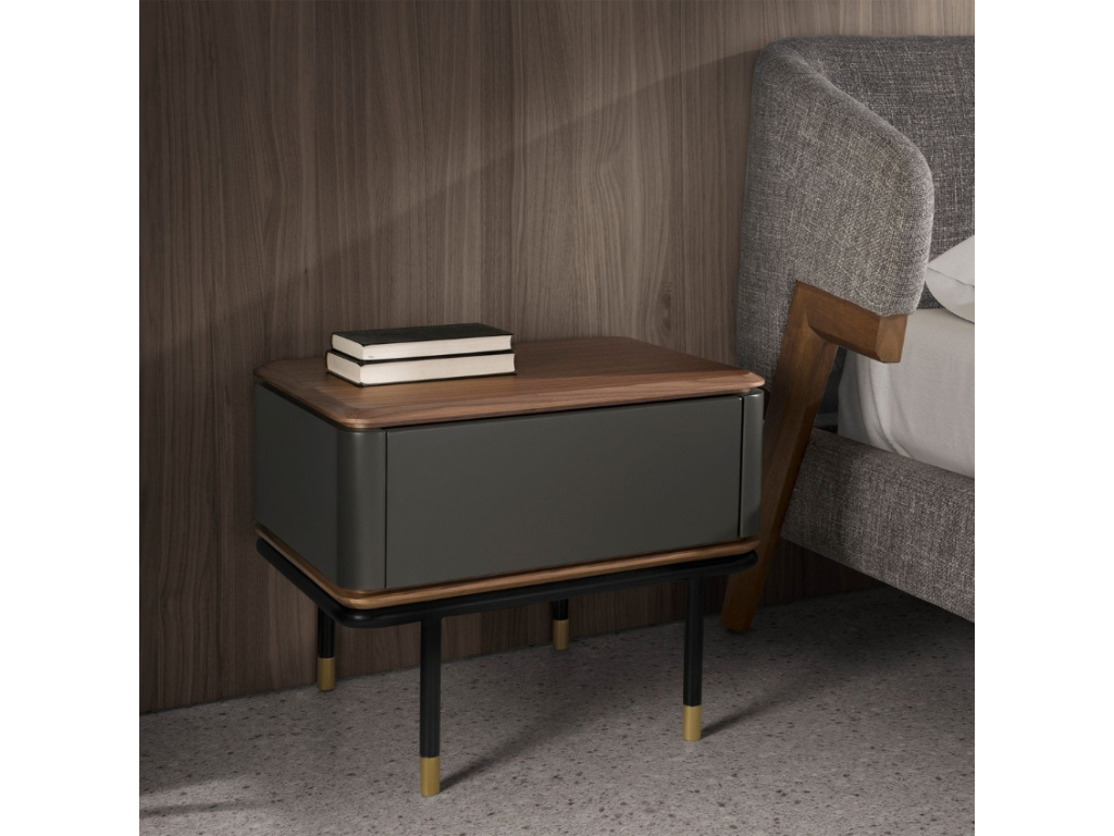 Tento elegantní noční stolek v matné šedém provedení přinese do vaší ložnice dokonalou souhru moderního designu a praktičnosti. Jeho ořechová deska s jemnou kresbou dřeva dodává nábytek hřejivý akcent, zatímco černá kovová podnož se zlatými detaily dodává celku luxusním dojmem. Praktická zásuvka se systémem push-to-open poskytne dostatek úložného prostoru pro vaši nezbytnost a udrží noční stolek vždy elegantně uspořádaný. Perfektní doplněk do minimalistické nebo industriální ložnice kde oceníte jeho čisté linie a kvalitní materiály.