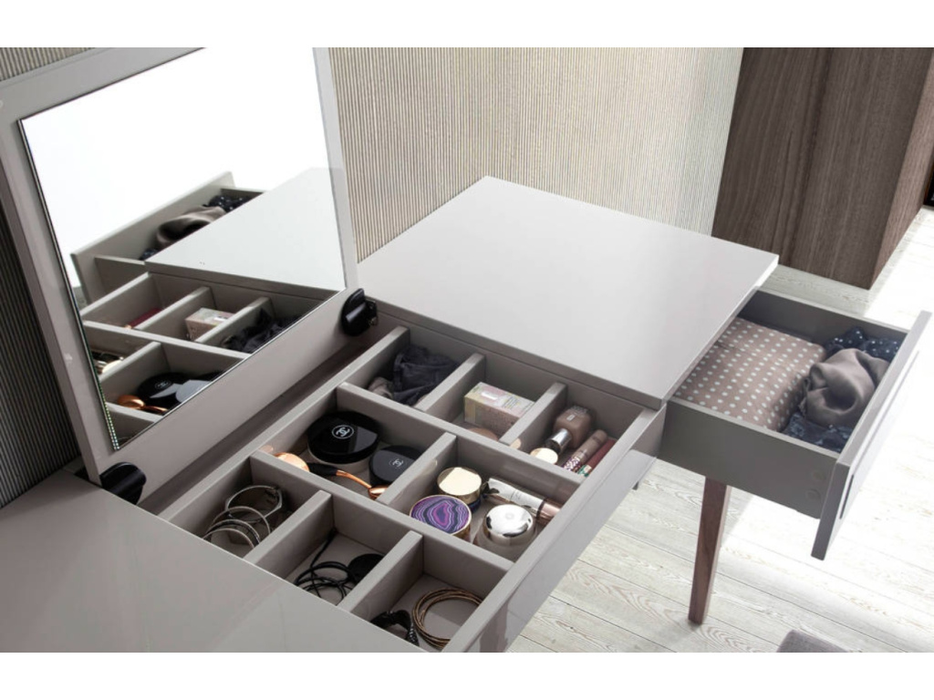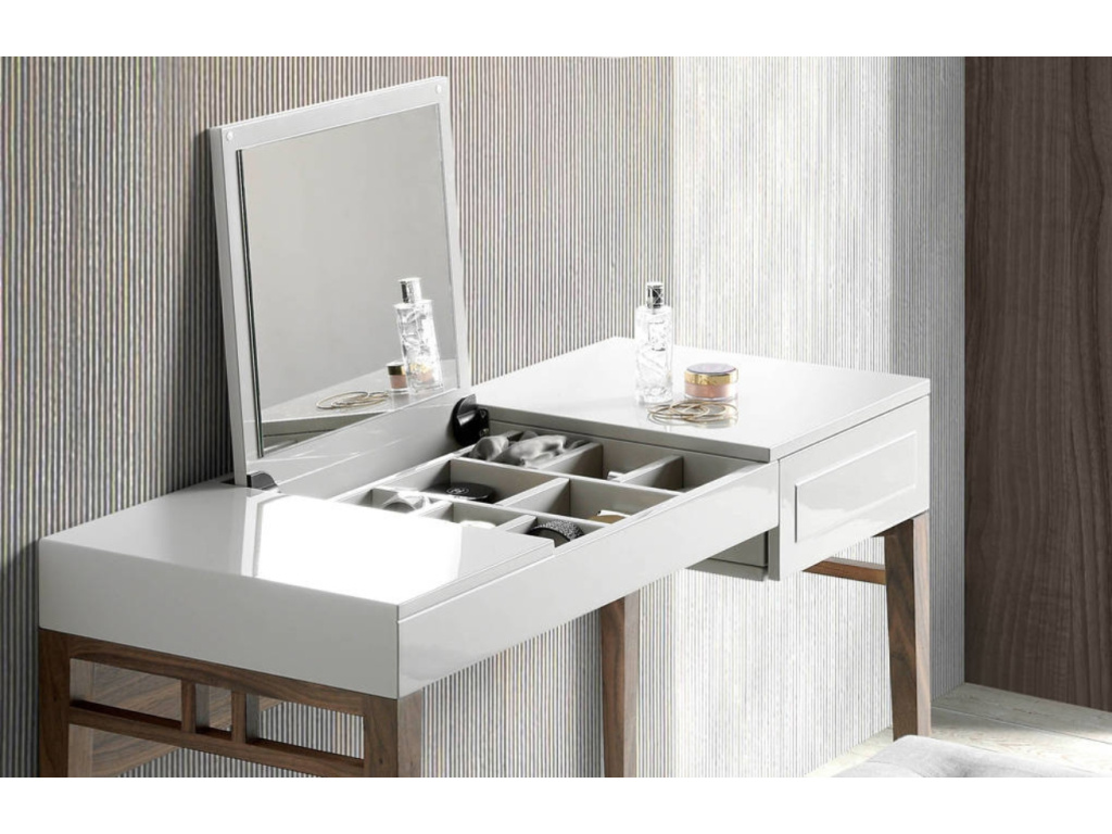 Hledáte ideální toaletní stolek, který by splňoval všechny vaše požadavky? Lakovaný stolek značky Angel Cerdá je jistě naplní. Jeho předností je velký úložný prostor v podobě zásuvky a uzavíratelné šperkovnice, která se vám odhalí při odkrytí centrální časti desky. Ta je navíc obohacena o čtvercové zrcadlo a tvoří tak ideální kosmetický koutek. Po zavření desky máte čistou pracovní plochu a stolek pak můžete využít třeba i jako pracovní stůl.