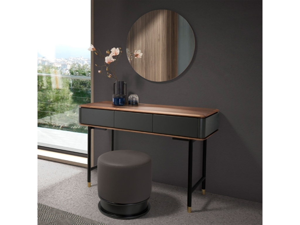Tento moderní toaletní stolek v kombinaci tmavě šedého laku a ořechové dýhy přinese do interiéru sofistikovanost a styl. Čisté linie doplňuje černá nerezová podnož s jemným zlatým akcentem, která působí nadčasově. Tři praktické zásuvky s tichým push & pull systémem nabízejí dostatek úložného prostoru na kosmetiku, doplňky nebo psací potřeby. Stolek bude ideální pomocník do ložnice nebo stylového pracovního koutku.