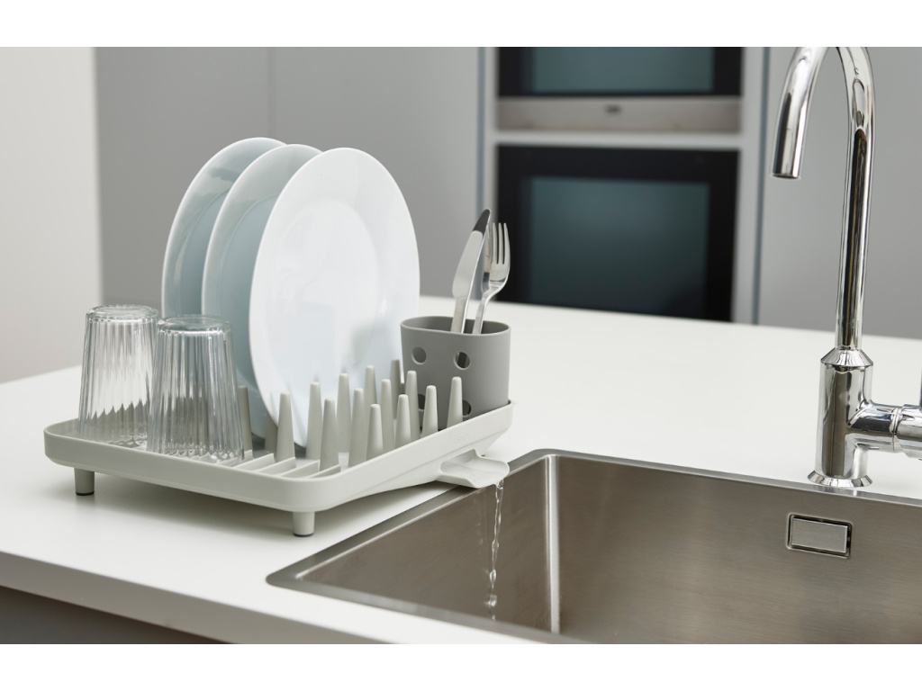 Stylový a praktický odkapávač Joseph Joseph Duo je ideálním řešením pro každodenní sušení nádobí v menších kuchyních. Díky promyšlenému uspořádání nabízí prostor pro talíře, sklenice, hrnky i příbory – vše přehledně a úsporně. Integrovaný odtok s výlevkou odvádí vodu přímo do dřezu, takže pracovní plocha zůstane suchá a čistá. Součástí je také odnímatelný držák na příbory, který lze snadno vyjmout a umýt. Díky modernímu šedému provedení skvěle zapadne do každé kuchyně a přináší nejen funkčnost, ale i elegantní vzhled.