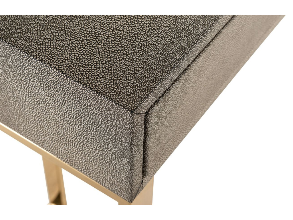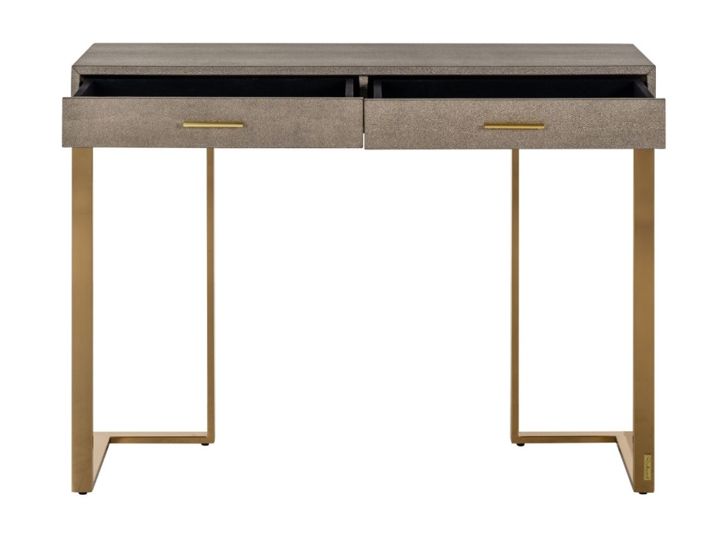 Toaletní stolek Marie-Lou značky Richmond zaujme svou výraznou zlatě lakovanou podnoží. Do interiéru s sebou přinese nádech elegance a luxusu. Jeho deska je vyrobená z MDF materiálu, který je ozvláštněn čalouněním z ekokůže šedé barvy. Stolek disponuje dvěma stejně velkými zásuvkami s podlouhlými úchytkami, které dokonale ladí s jeho ocelovou podnoží.