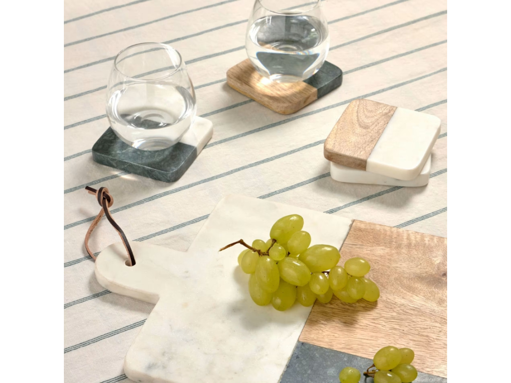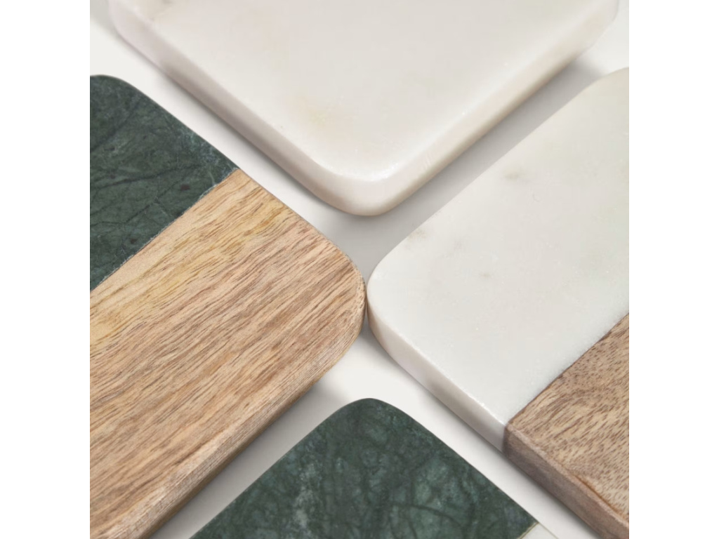 Set podtácků Wilmina bude praktickým doplňkem pro každý konferenční stolek i jídelní stůl. Ať už večerní drink nebo odpolední kávičku – odložte na ně cokoliv, co zrovna popíjíte. Pomohou vám vyvarovat se nevzhledným kroužkům na desce stolu. V setu najdete čtyři kusy, každý z nich je jiný – zelený a bílý mramor a mangové dřevo se perfektně doplňují.