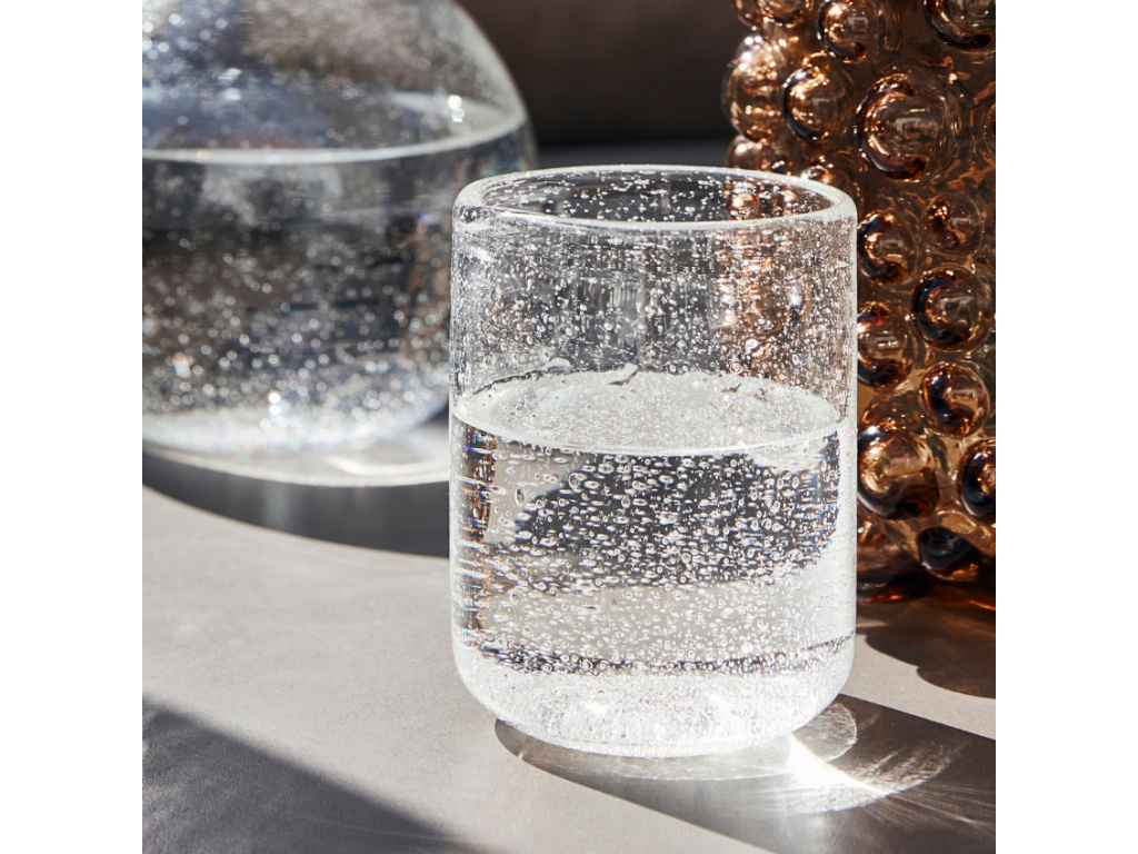 Set čtyř sklenic Rich od značky House Doctor si ihned oblíbíte pro jeho atraktivní vzhled. Sklenice jsou ručně vyráběny z čirého skla, které je doplněno vzduchovými bublinkami, což vytváří elegantní prvek u jinak čistého a funkčního designu. Díky tomu se vám skleničky budou jednoduše kombinovat s dalšími kuchyňskými předměty a navíc se mohou mýt v myčce na nádobí.