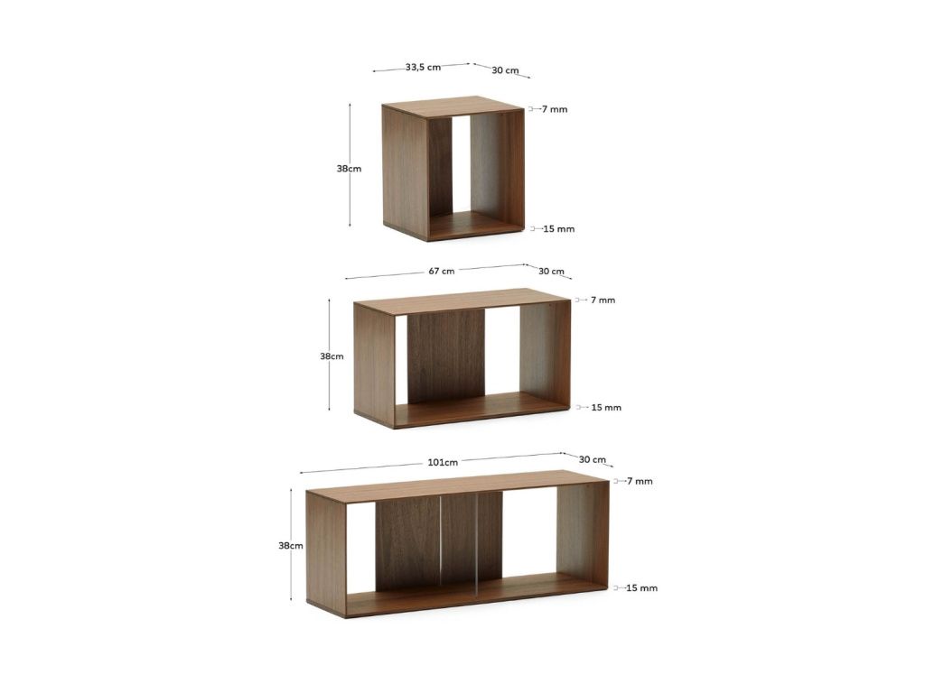 Sestavit úložný policový systém podle vlastních potřeb nebylo nikdy jednodušší! Série produktů Litto od španělské značky Kave Home obsahuje modulární police, které jednoduše seskládáte a vytvoříte tak stylové místo pro uskladnění knížek, dekorací i nejrůznějších trofejí a ocenění. Součástí každého produktu jsou komponenty k upevnění ke zdi i k dalším policovým dílům, takže police budou vždy bezpečně na svém místě. Celá série je dostupná ve dvou provedeních – v ořechové dýze i v přírodně zbarvené dubové dýze. Police se skvěle hodí do minimalistických i scandi interiérů, využití najdou v každé místnosti. Dostupné jsou ve velikostech S, M a L a také v různých setech. V tomto setu najdete police velikosti S, M a L a to vždy po 3 kusech. Pokud police seskládáte dle hlavní produktové fotky, získáte rozměr 76 x 168 cm, poskládání polic je však možné různými způsoby.
