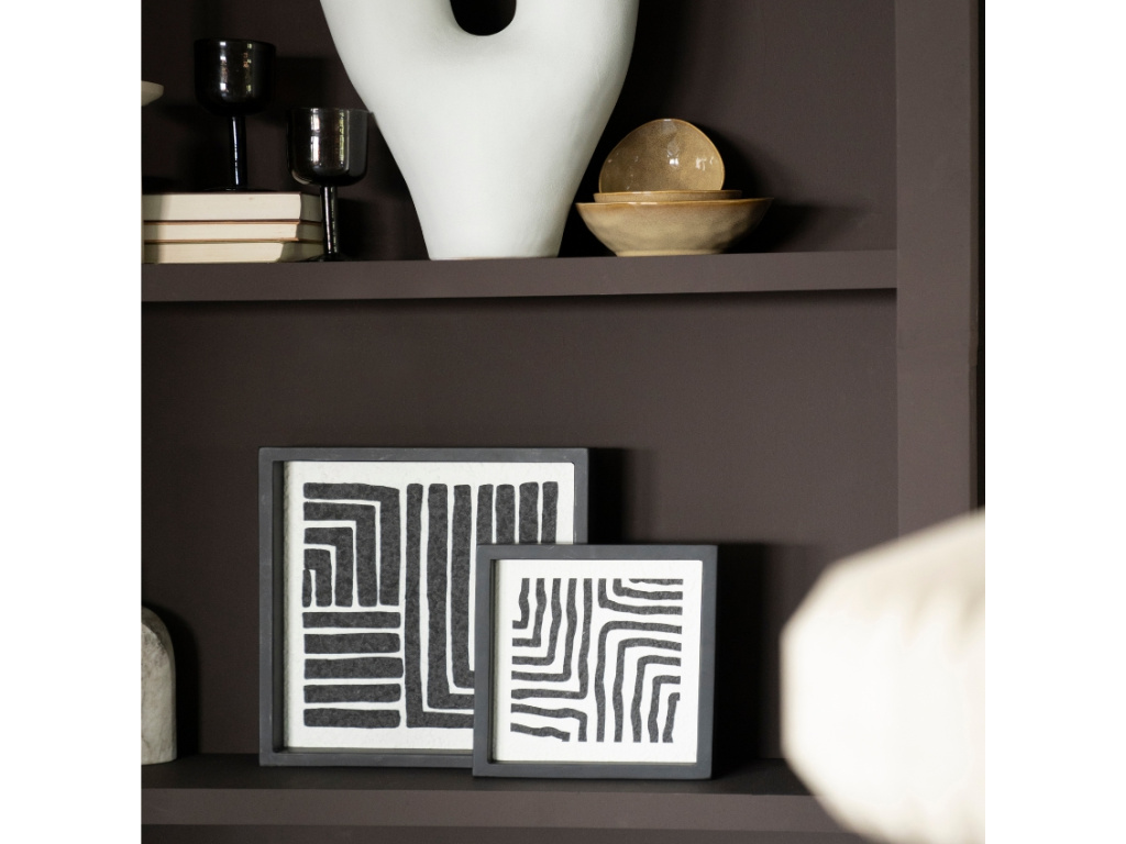 Vaše stěna získá osobitý šarm s tímto setem abstraktních obrazů Triq. Černobílý etno vzor na strukturovaném papíře přitáhne pohled a vnese do prostoru jemnou dramatičnost. Hluboký dřevěný rám v černé barvě zvýrazňující kontrastní motiv a dodá obrazu elegantní hloubku. Set se bude perfektně doplňovat s přírodními texturami nebo monochromatickými interiéry. Můžete je posvětit společně pro vytvoření harmonického celku nebo je rozmístit odděleně, aby každý z nich vynikl samostatně.
