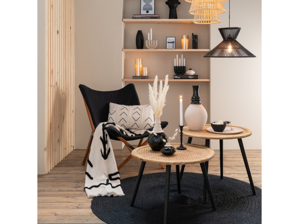 Set konferenčních stolků Bimbo značky J-line skvěle doplní interiéry zařízené v boho nebo etnickém stylu. Přispějí svým přírodním vzhledem a rozpoutají příjemnou atmosféru v kterékoli místnosti. Vzorovaná deska z bambusu v kombinaci s kovovou podnoží tvoří dohromady atraktivní a vzdušný design. Stolky můžete rozmístit dle libosti nebo je ponechat jako set a získat tak větší prostor pro odložení kávy, knihy i občerstvení.