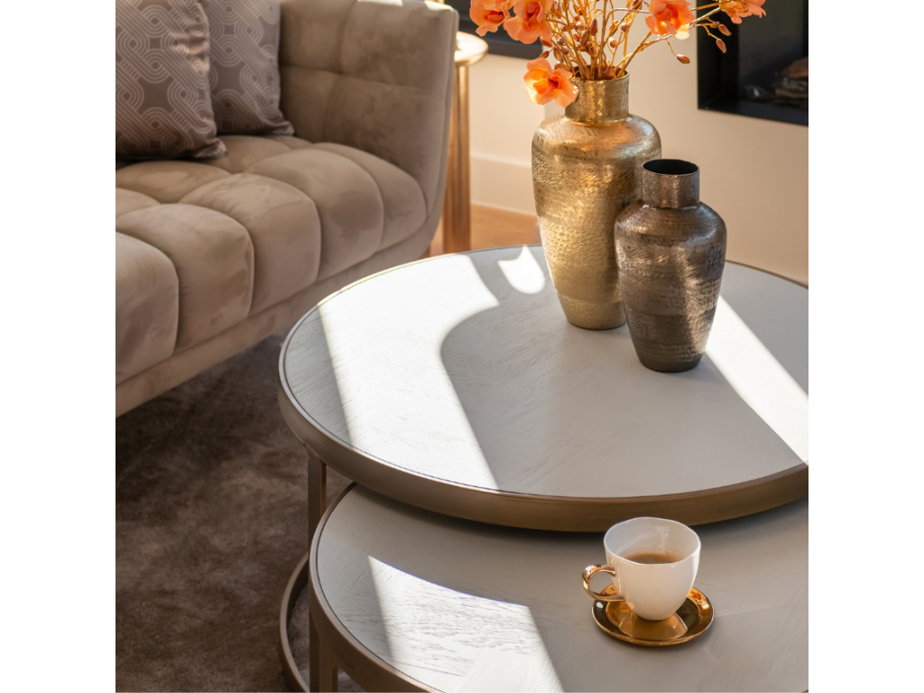 Představujeme vám set dvou luxusních konferenčních stolků Whitebone od značky Richmond, který je charakteristický výrazným barevným kontrastem. Tento set bude perfektním doplňkem nejen do vašeho obývacího pokoje. Dvě prostorné desky z dubové dýhy o průměrech 91,5 a 74 cm zaručí dostatek prostoru pro všechno potřebné, ať už si chcete pochutnat na oblíbeném jídle, nebo mít dostatek místa na dekorace, ovladače a rozečtené knihy. Stolky Whitebone lze umístit každý zvlášť, nebo společně – díky rozdílným výškám lze stolky částečně zasunout pod sebe.