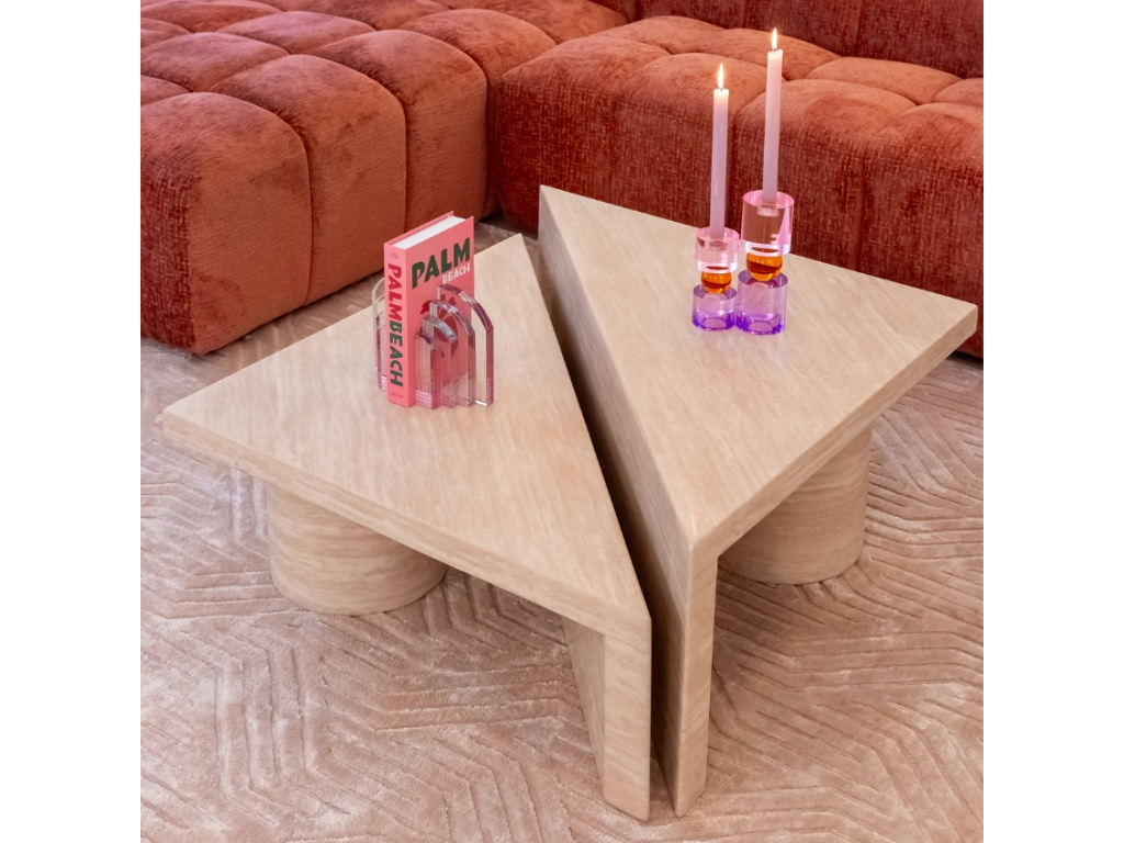 Set dvou konferenčních stolků Richmond Fictus upoutá vaši pozornost svým nevšedním vzhledem díky zpracování travertinového kamene. Vašemu interiéru přinese nádech luxusu a elegance. Travertin je druh vápence vyznačující se odolností a porézní texturou, která dodává stolkům přirozenou krásu a časem i jedinečnou patinu. Stolky můžete libově kombinovat společně, nebo umístit každý samostatně na jiné místo ve vašich prostorách.