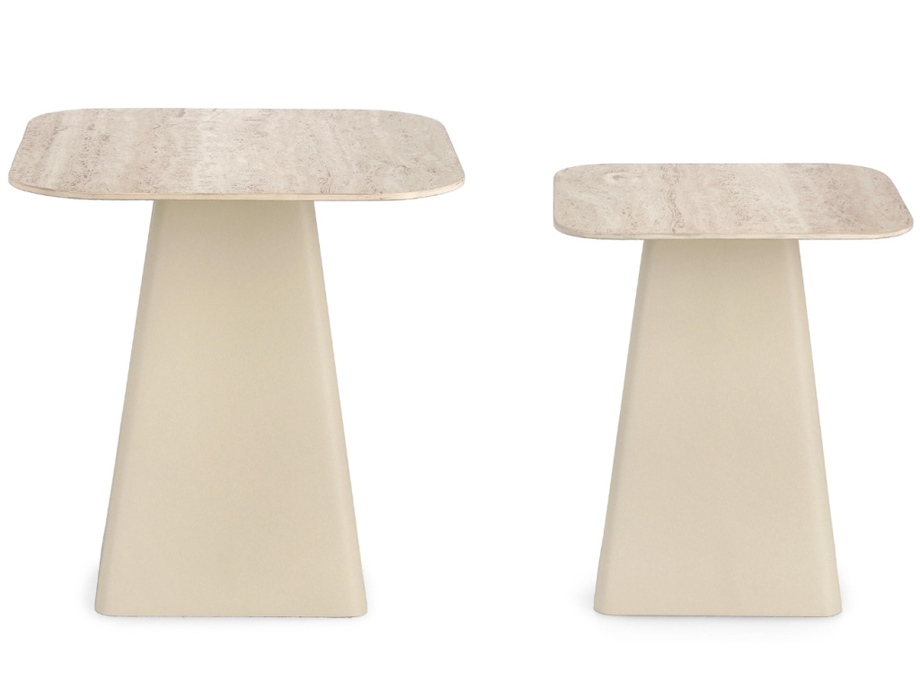 Set dvou konferenčních stolků Hardy od značky Bizzotto si vás ihned získá, a to díky použitým materiálům a barvě. Stolky mají keramické desky s travertinovým efektem, které jsou doplněny o masivní ocelové podnože v neutrální béžové barvě. Ta dodá interiéru nádech luxusu a elegance. Doplňte svůj komerční i domácí prostor s tímto perfektním setem, který hravě zapadne do všech světlejších interiérů.