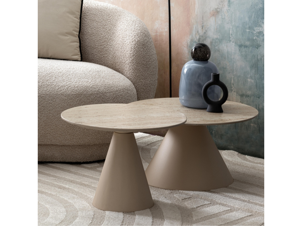 Set dvou konferenčních stolků Hardy od značky Bizzotto si vás ihned získá, a to díky použitým materiálům a barvě. Stolky mají keramické desky s travertinovým efektem, které jsou doplněny o masivní ocelové podnože v neutrální béžové barvě. Ta dodá interiéru nádech luxusu a elegance. Doplňte svůj komerční i domácí prostor s tímto perfektním setem, který hravě zapadne do všech světlejších interiérů.