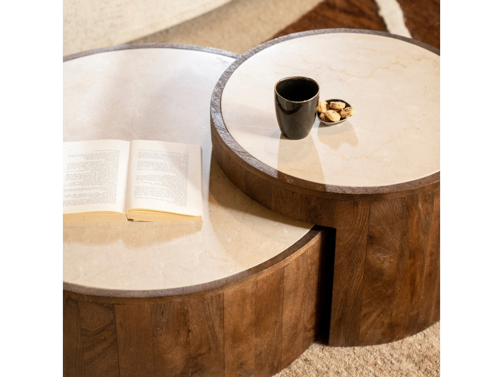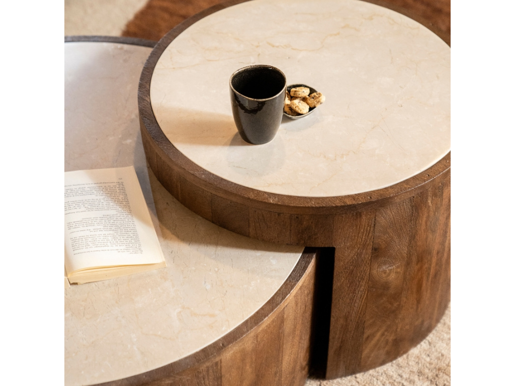 Set dvou konferenčních stolků Hazel od značky Eleonora je skvělým způsobem, jak přinést do vašeho domova kousek přírody. Desky stolků jsou vyrobeny z mramoru, který je kombinován s podnožemi z mangového dřeva, což dodává stolům přirozený a elegantní vzhled. Díky různým výškám stolů je můžete flexibilně kombinovat – jeden zasunout pod druhý, čímž vytvoříte originální kaskádovitý efekt. Tento design vám poskytne ideální prostor pro odložení šálku kávy, nebo vystavení dekorací a drobných předmětů, které budou ještě více vynikat.