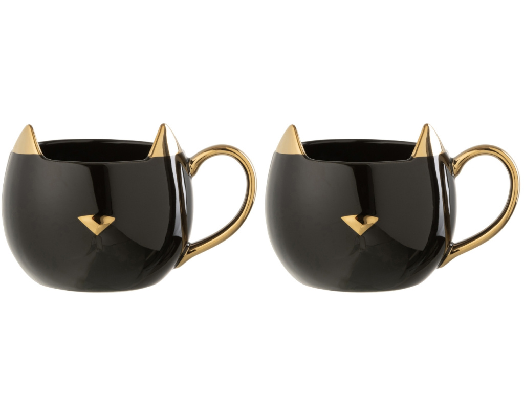 Co takhle rozšířit váš čajový servis o dva neodolatelné hrnečky s motivem koček J-line Kitty? Hrnečky jsou ozdobeny drobnými oušky a čumáčkem a zaujmou svým lesklým černým zbarvením. To je vkusně doplněno zlatými detaily. Hrnečky samozřejmě nemusíte používat jen na čaj, chutnat vám z nich bude káva, horká čokoláda i osvěžující studené nápoje.