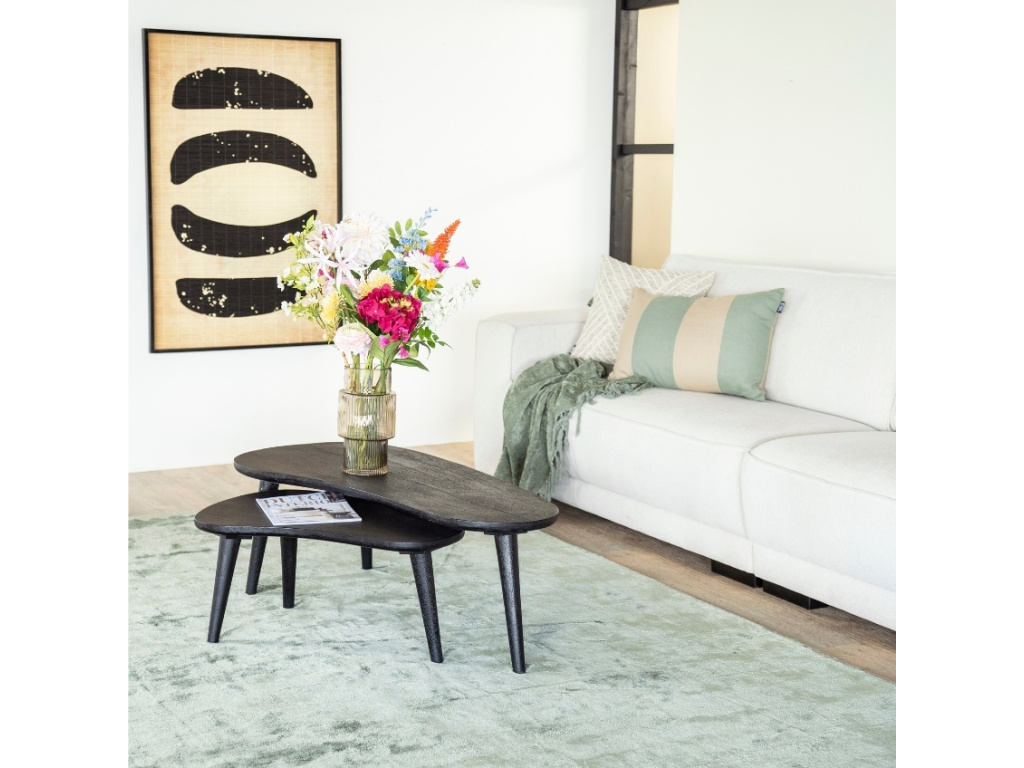 Set stolků Guus z mangového dřeva je perfektní volbou pro milovníky přírodních materiálů a organických tvarů. Desky obou stolků mají nepravidelný tvar, který působí přirozeně a zároveň moderně. Menší stolek se dá částečně zasunout pod větší, což vytváří praktickou a prostorově úspornou variantu. Díky černému provedení získají váš interiér hloubku a styl. Set Guus vnese do vašeho domova jedinečný vzhled a praktičnost v jednom.