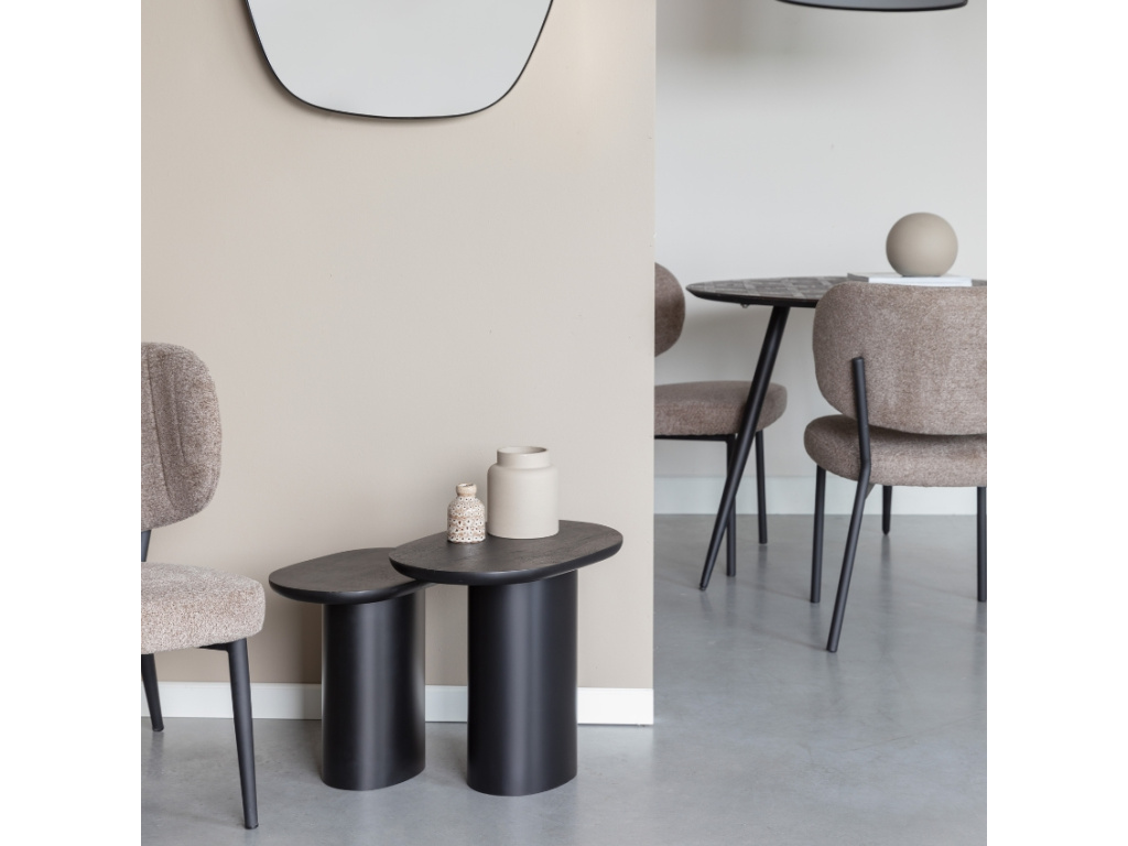 Set oválně tvarovaných odkládacích stolků BELA od značky White Label Living zaujme již na první pohled svým minimalistickým vzhledem. Nadčasový design kombinuje dřevo masiv a kov, čímž získává na originalitě a jedinečnosti. Povrch desek se pyšní nádhernou strukturou dřeva, který chrání ručně nanesený černý nátěr. Desky stolků dokonale ladí s hladkou podnoží z lakovaného kovu. Odložte si na ně svoji odpolední kávu nebo právě rozečtenou knížku.