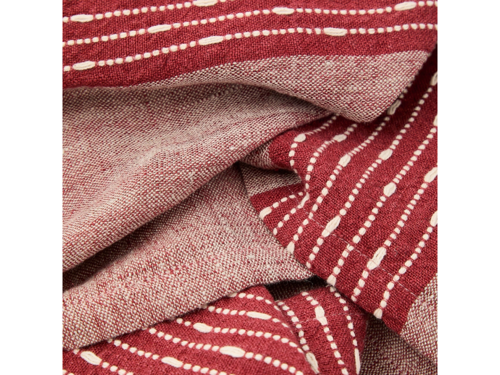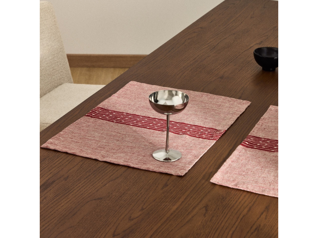 Kolekce Calena oslavuje přirozenou krásu lnu skrze precizní žakárové tkaní, které do interiéru vnáší texturu a hřejivou atmosféru. Čistý design s výrazným středovým pruhem v terakotově červeném odstínu dodává prostřenému stolu moderní charakter s nádechem rustikální elegance. Tyto doplňky jsou navrženy pro milovníky nadčasových materiálů, kteří hledají harmonii mezi tradičním řemeslem a současným stylem bydlení. Len jako ušlechtilý materiál navíc zajišťuje vysokou odolnost a s každým vypráním získává na své osobité jemnosti a charakteru.