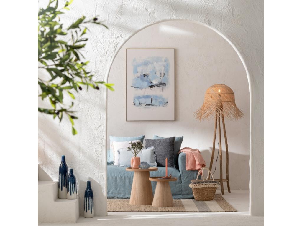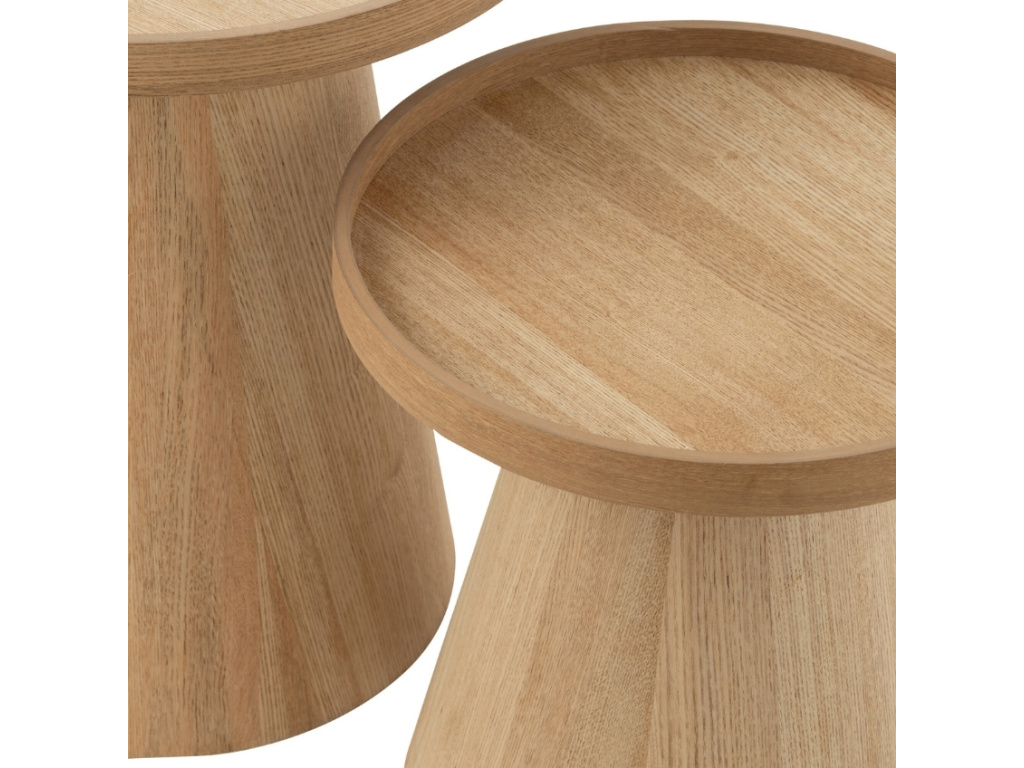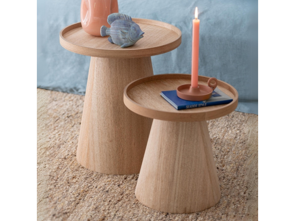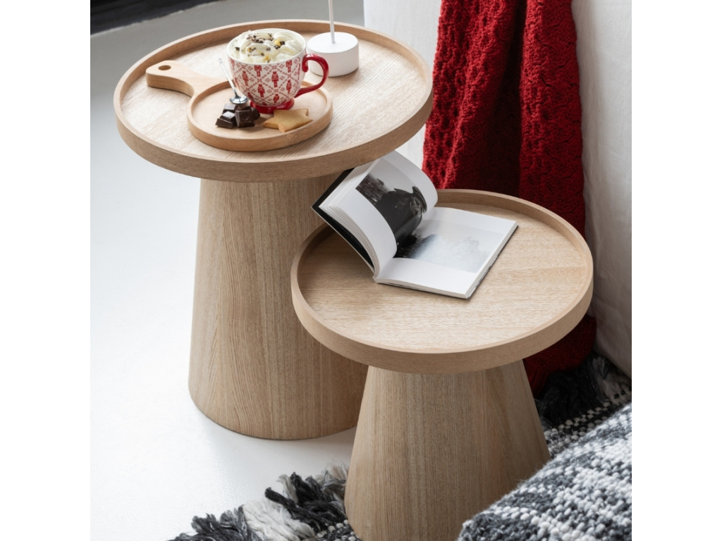 Set dvou odkládacích stolků Munk z masivního dřeva v přírodním odstínu vyniká minimalistickou elegancí. Stolky mají kulatou desku s vyvýšeným okrajem, což je praktické, protože zabraňuje pádu předmětů, a kuželové podnože zajišťují nejen atraktivní vzhled, ale i vysokou stabilitu. Tyto univerzální stolky skvěle poslouží vedle pohovky nebo křesla jako místo pro odložení knihy a kávy nebo na aranžování sezónních dekorací.