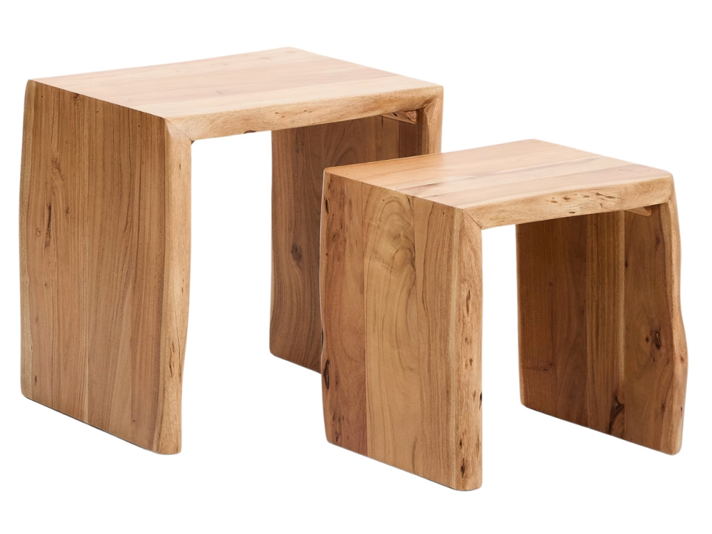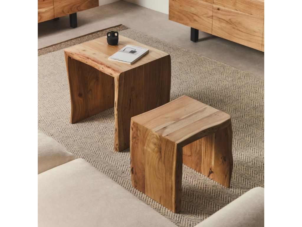 Set dvou odkládacích stolků Lomiri přináší harmonii přírodních materiálů a nadčasového designu. Vyrobeny z masivního akátového dřeva zaujmou přirozenou kresbou a lehce rustikálním, ale stále moderním výrazem. Každý kus je jedinečný – s vlastním tónem, strukturou a charakterem. Díky rozdílné velikosti stolky snadno zasunete pod sebe nebo využijete samostatně podle potřeby. Perfektní jako elegantní duo vedle pohovky, postele nebo do čtecího koutku. Lomiri dodá vašemu interiéru útulnou atmosféru a dotek poctivého řemesla – stolky skvěle zapadnou do skandinávských, boho i rustikálních prostorů.