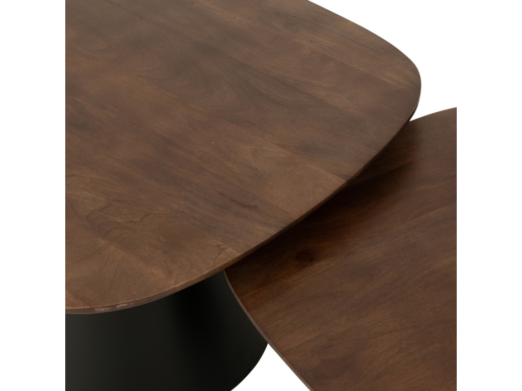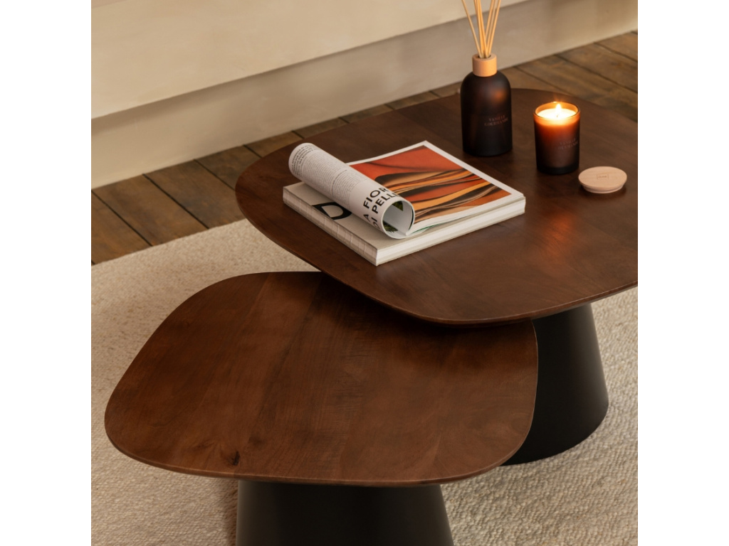 Set dvou odkládacích stolků Ekko vnese do vašeho interiéru eleganci a moderní charakter. Díky univerzálnímu provedení je snadno umístíte do obývacího pokoje, pracovny i ložnice, přičemž jejich odlišná výška vám umožní využít je dohromady nebo samostatně podle nálady a potřeb. Desky z mangového dřeva okouzlí svou přirozenou kresbou a dodají každému stolku jedinečný šarm. Nabídnou ideální plochu pro odložení šálku kávy, knih či dekorací. Díky svému designu se tento kousek stane výrazným doplňkem, který okamžitě upoutá pozornost.