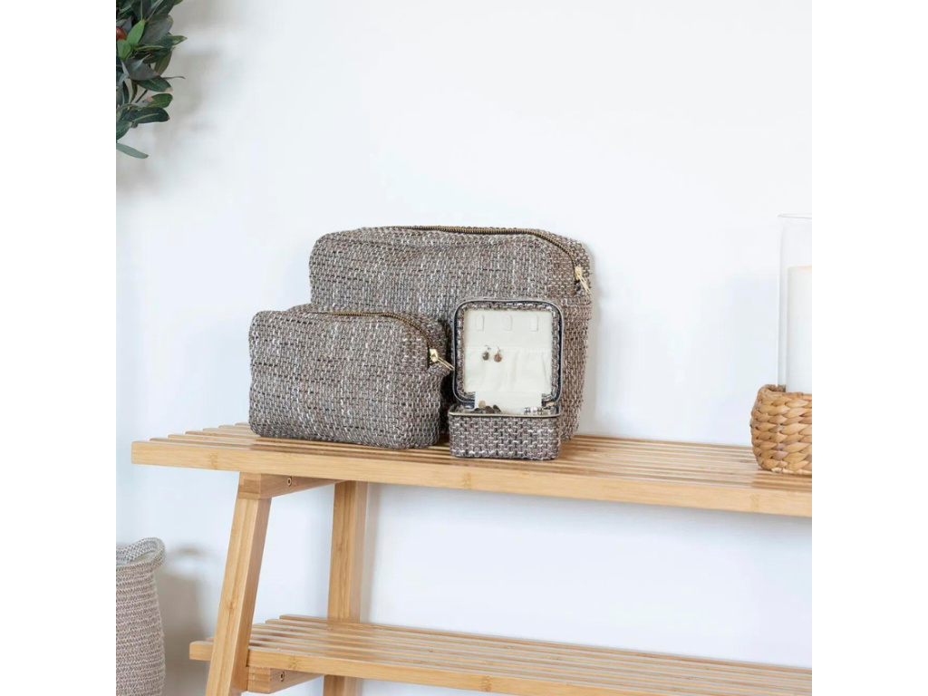 Dopřejte si špetku luxusu s elegantním setem dvou toaletních tašek Safi značky Nordic Living, vyrobených ze strukturované látky v harmonických odstínech hnědé. Menší taška je ideální pro drobnosti, které potřebujete mít stále po ruce, zatímco větší nabízí dostatek prostoru pro všechny vaše kosmetické nezbytnosti. Set Safi vám poskytne nejen funkční úložný prostor, ale také přinese nádech luxusu do vašich všedních dní. Uspořádejte si své kosmetické poklady s grácií, ať už jste doma nebo na cestách.