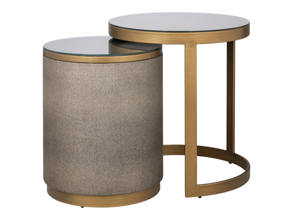 Vneste do svého interiéru nádech luxusu se setem dvou odkládacích stolků od značky Richmond. Tyto stylové stolky kombinují eleganci a funkčnost. Jejich zlatá mosazná konstrukce a jemně texturovaný povrch z umělé kůže vytvářejí dokonalou harmonii mezi moderním designem a klasickou estetikou. Díky svému unikátnímu tvaru můžete menší stolek snadno uschovat pod větší, což šetří místo a nabízí flexibilitu v uspořádání. Skleněná deska poskytuje praktický povrch pro umístění dekorací, stolních lamp či šálků. Tento set je ideálním doplňkem pro každého, kdo si přeje vytvořit stylový a zároveň funkční domov.