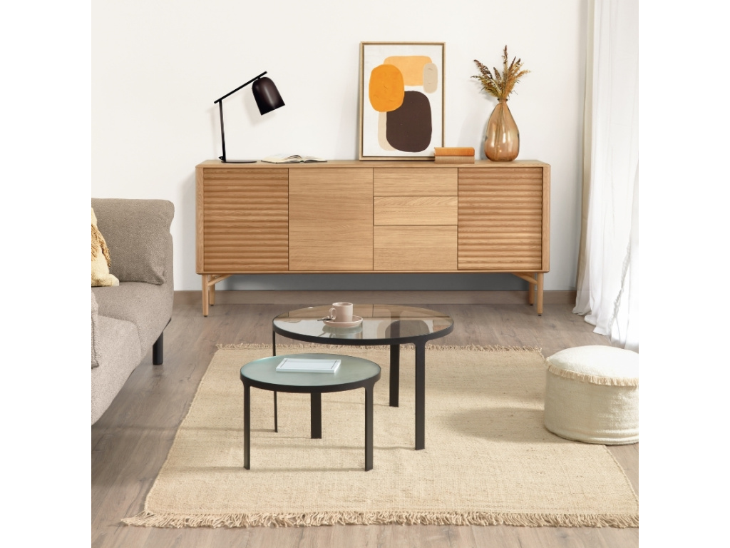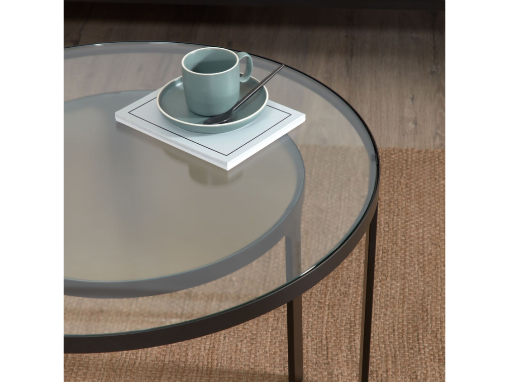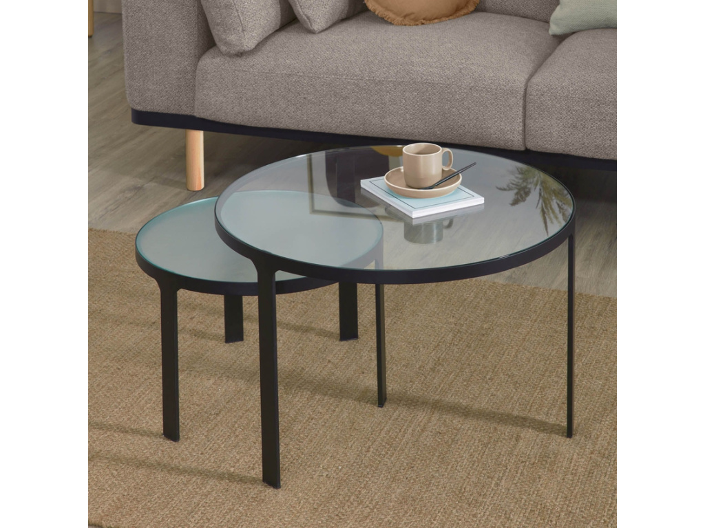 Pokud milujete společnost a ve vašem obývacím pokoji často hostíte své přátele či rodinu, určitě oceníte tento set dvou konferenčních stolků Oni od značky Kave Home. Využijete je k naservírování odpolední kávy i drobného pohoštění. Do černě lakované konstrukce stolků jsou zasazené skleněné desky. Větší stolek má čiré sklo, na menším najdete mléčné sklo s jemnou texturou.