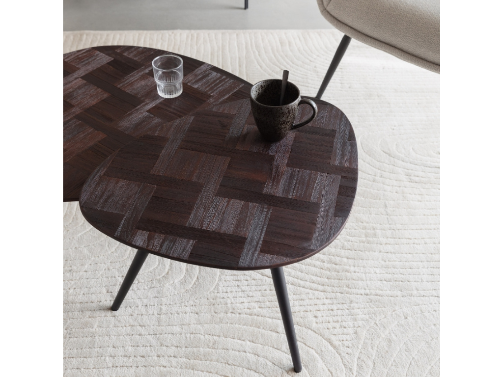 Atypicky tvarované konferenční stolky PION od značky White Label Living zaujmou již na první pohled svým minimalistickým vzhledem. Nadčasový design kombinuje dřevo a kov, čímž získává na originalitě a jedinečnosti. Povrch desek se pyšní nádhernou teakovou dýhou, která svojí strukturou vytváří jedinečný charakter setu. Desky stolků dokonale kontrastují s hladkou podnoží z lakovaného kovu. Odložte si na něj i vy svoji odpolední kávu nebo právě rozečtenou knížku.