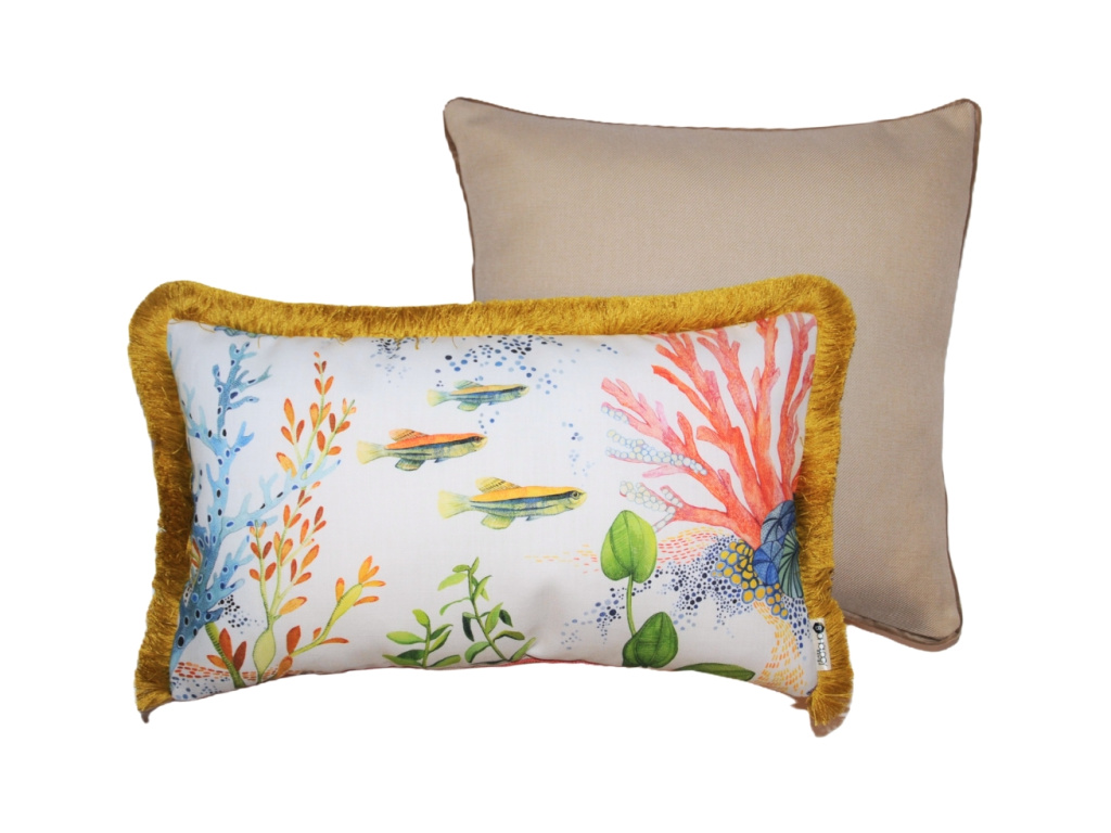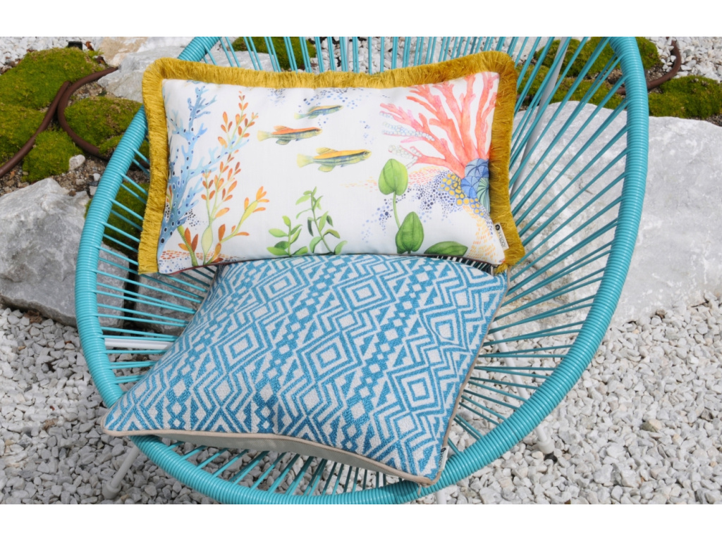 Set dvou venkovních povlaků na polštář se skládá ze série Marine a Aztec od české značky BOHOLOGY, která je vyrábí z kvalitních anglických látek Osborne&Little. Povlak s motivem podmořského světa o rozměrech 30 x 50 cm má okraje lemující třásněmi ve žluté barvě, druhý povlak s čtvercovým rozměrem 45 x 45 cm je s aztéckým vzorem v modrém odstínu. Oba mají jednu stranu jednobarevnou, takže pokud zatoužíte po změně, můžete polštář kdykoliv otočit a vzor tak na chvíli skrýt. Díky tomu získáte místo dvou rovnou čtyři různé designy, které můžete obměňovat. Jsou vhodné do interiéru i exteriéru, kde snesou nečekaný déšť a po stranách mají skrytý zip, díky čemuž se dají pohodlně sundat a prát.