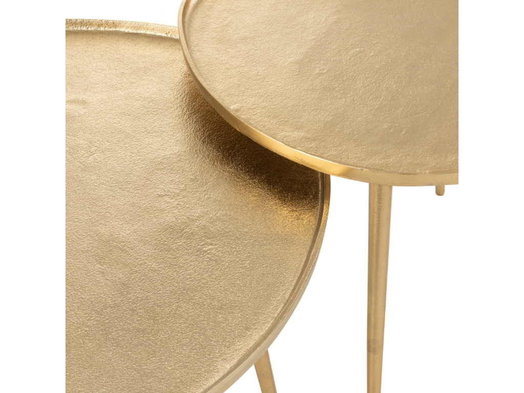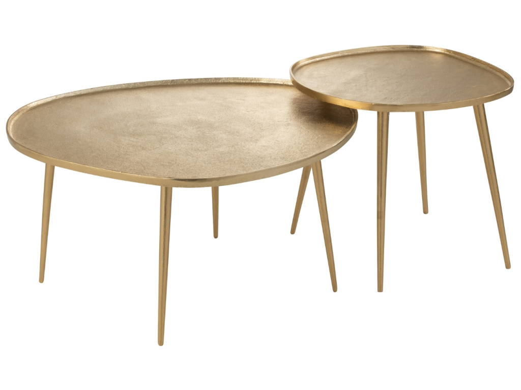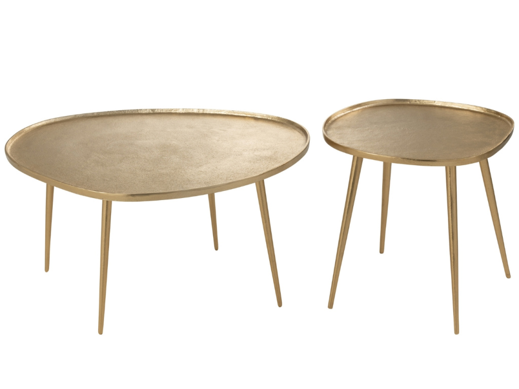 Zlatý set odkládacích stolků Vinta v sobě kombinuje eleganci a současný design. Jemně nepravidelné tvary a tenká kovová podnož dodávají celku lehkost i šmrnc. Stolky působí luxusně, ale zároveň přirozeně zapadnou do různých interiérových stylů. Díky svým rozměrům skvěle poslouží jako místo pro kávu, květiny nebo dekorace. Můžete je používat samostatně i dohromady, podle potřeby a nálady. Pozlacený povrch vytváří hřejivý dojem a přináší do prostoru nádech glamouru. Hodí se do obývacího pokoje, ložnice i vstupní haly, a je tak ideální volbou pro ty, kteří hledají funkční design s osobitým charakterem.