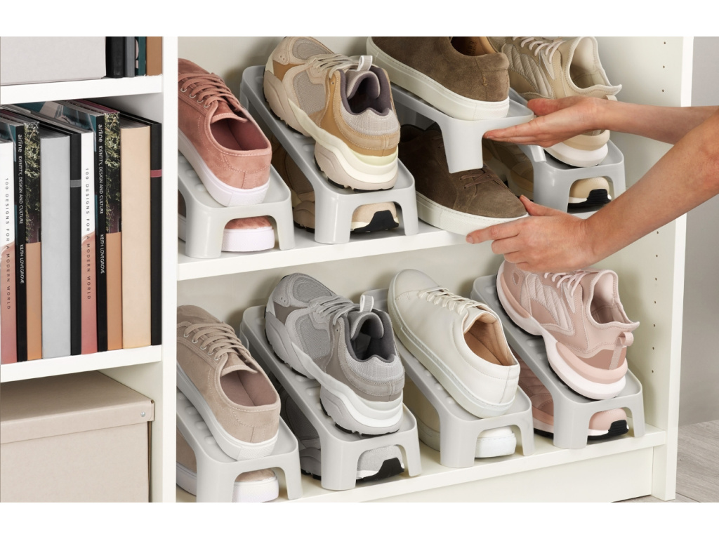 Chytré a úsporné řešení pro každého, kdo chce mít ve své skříni nebo botníku přehled. Set Shoe-In od Joseph Joseph obsahuje 6 kusů praktických organizérů, které umožní skladovat každý pár bot vertikálně – a tím ušetřit až polovinu místa oproti běžnému uložení. Držáky mají protiskluzový povrch, nastavitelnou výšku pro různé typy obuvi a díky kompaktnímu tvaru se snadno vejdou do většiny botníků či polic. Elegantní béžový odstín působí čistě a decentně, takže se hodí do každého interiéru. Je ideální pro tenisky, baleríny, mokasíny i dětskou obuv – a skvělý způsob, jak udržet obuv přehledně, hygienicky a s maximálním využitím prostoru.
