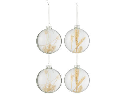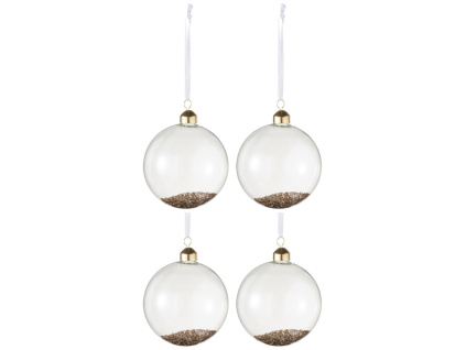 Tento set šesti skleněných vánočních ozdob Gloss, které jsou naplněny jemnými zlatými třpytkami, přinesou jiskru každému vánočnímu stromku. Zlatý kroužek a bílá stuha dodávají ozdobám elegantně slavnostní nádech. Set je ideální pro ty, kteří chtějí do své výzdoby přinést trochu luxusu a rozzářit ji, aniž by ale působila příliš extravagantně. Skvěle se kombinuje s minimalistickými nebo zlatem laděnými dekoracemi.