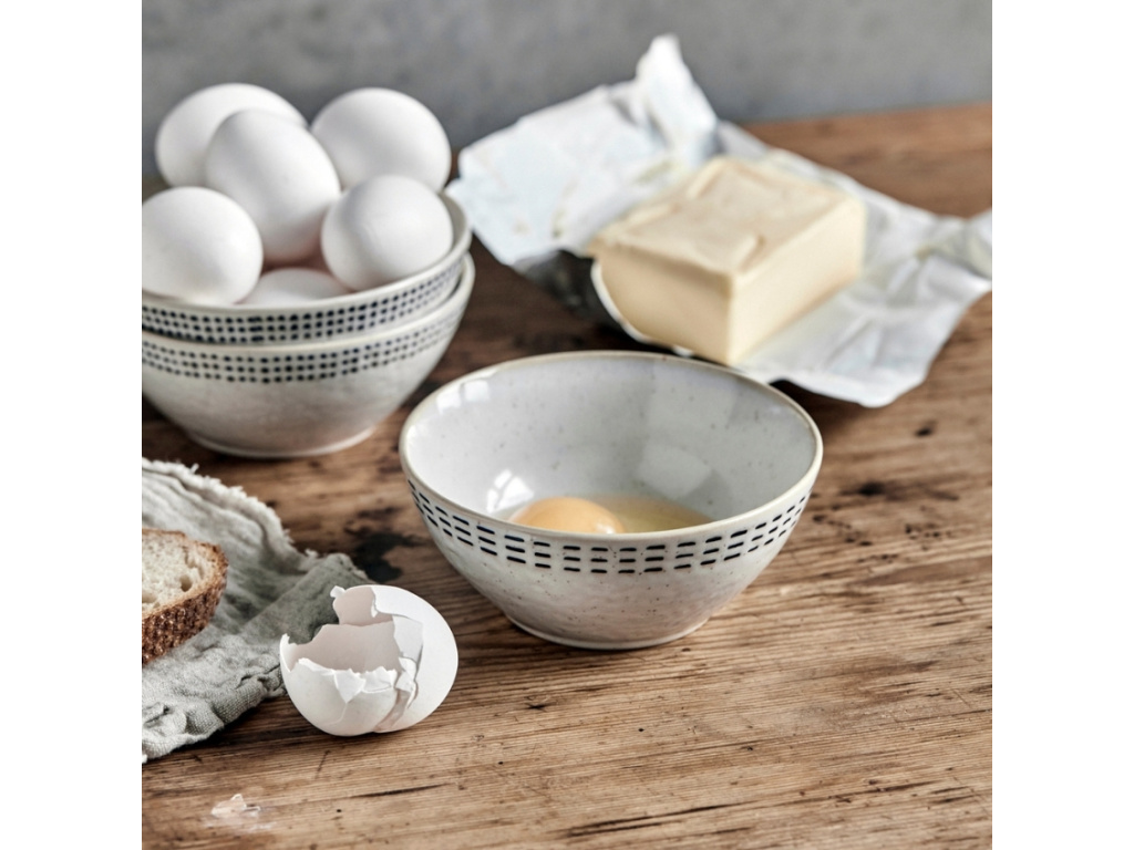 Set tří kameninových misek přinesou do vaší kuchyně útulnou atmosféru s jemným rustikálním nádechem. Každý kus s bílošedým podkladem se pyšní trochu odlišným dekorem připomínajícím stehy vyšívané modrou nití, které zdůrazňují unikátnost a ruční zpracování. Misky jsou navíc vhodné do myčky i mikrovlnky. Doporučujeme je doplnit i o set hrnků ze stejnojmenné kolekce.
