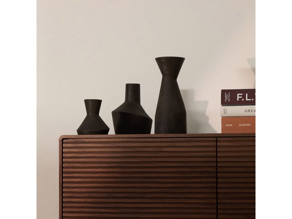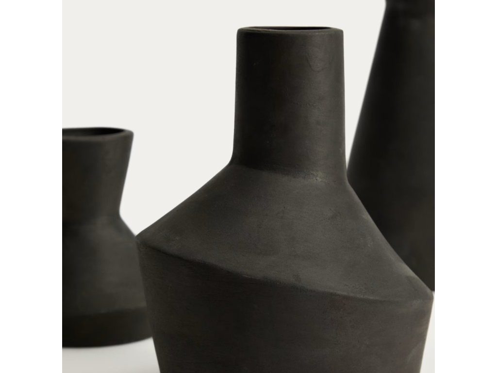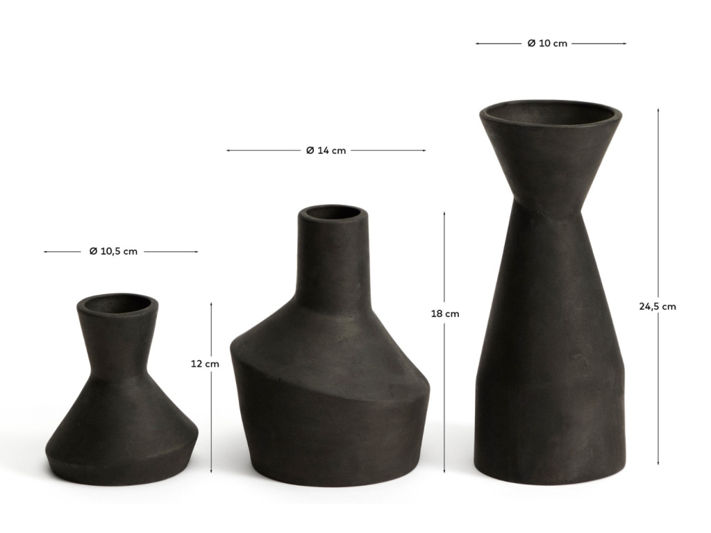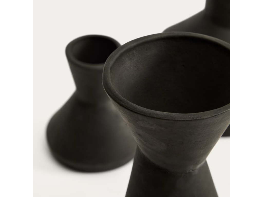 Set váz Dunari je stylovým doplňkem, který propojuje přírodní charakter terakoty s moderním výrazem černé povrchové úpravy. Sada obsahuje tři vázy různých velikostí, které dohromady tvoří harmonický celek, ale zároveň vyniknou i samostatně. Každá z váz má jednoduchý, nadčasový tvar a matný povrch, který zdůrazňuje strukturu materiálu a dodává celku elegantní, mírně rustikální nádech. Dunari je ideální volbou pro ty, kdo hledají originální set doplňků, který vnese do prostoru minimalismus a přírodní autenticitu.