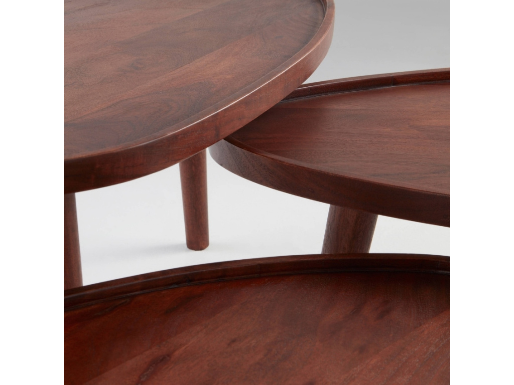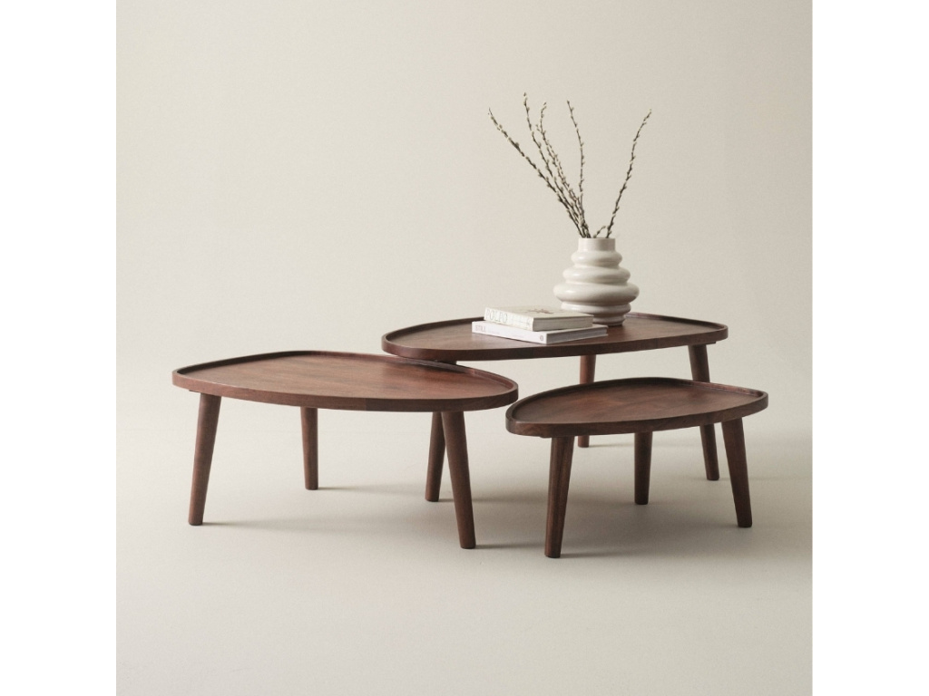 Hledáte stylový a zároveň praktický nábytek, který se přizpůsobí vašim potřebám? Sada tří konferenčních stolků MANIAGO je ideální volbou pro každého, kdo chce kombinovat moderní design, přírodní materiály a funkčnost. Stolky jsou vyrobené z kvalitního mangového dřeva, které se vyznačuje vysokou pevností a krásnou strukturou. Díky pečlivě zpracované povrchové úpravě získává dřevo hluboký lesk, který podtrhuje jeho přirozenou kresbu a dodává mu jedinečný charakter. Jedním z největších benefitů této sady je její variabilita. Stolky můžete snadno zasunout jeden pod druhý, čímž ušetříte místo nebo je kdykoliv rozložit vedle sebe a získat tak větší odkládací plochu. Čisté linie a přírodní materiály umožňují snadné kombinování s různými styly interiéru – ať už máte rádi boho, industriální nebo minimalistický styl, stolky MANIAGO se skvěle začlení do vašeho domova. Dopřejte si do svého domova styl, kvalitu a flexibilitu s konferenčními stolky MANIAGO!