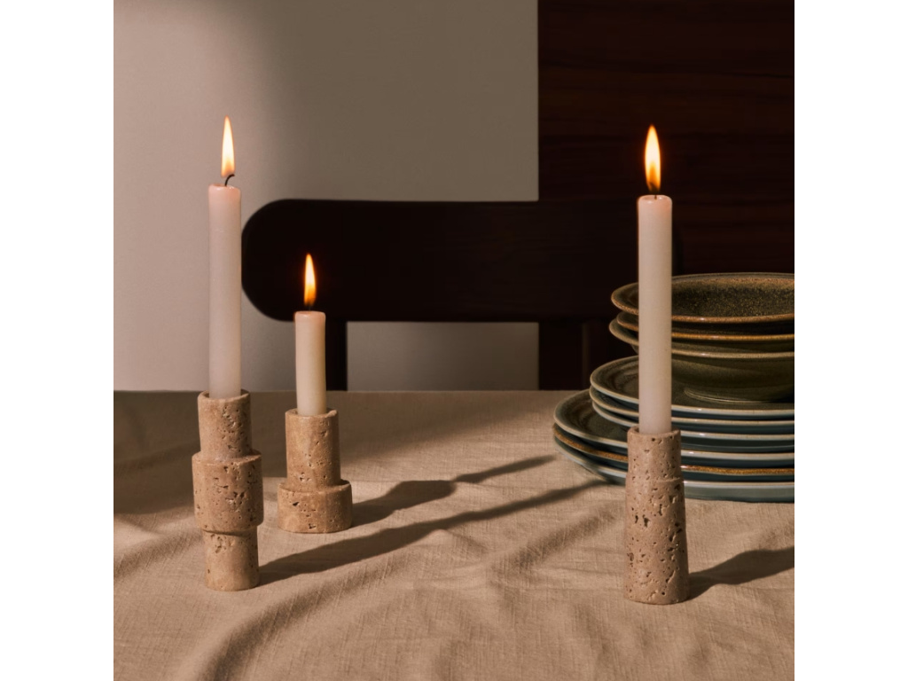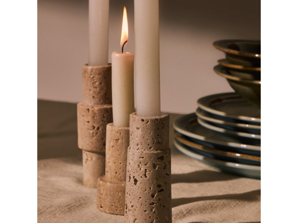 Travertin ztělesněný v setu tří svícnů Majid bude elegantní dekorací pro každý interiér. Na odkládacím stolku, komodě nebo pracovním stole – všude budou tyto svícny na vysoké svíčky skvělou ozdobou. Použitý přírodní materiál se postará o to, že je každý kousek originální a jedinečný.